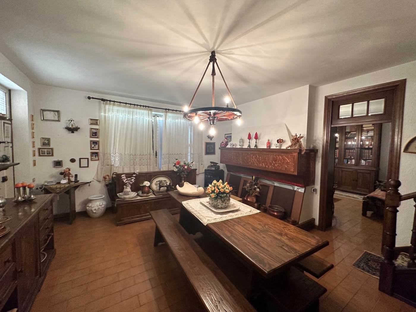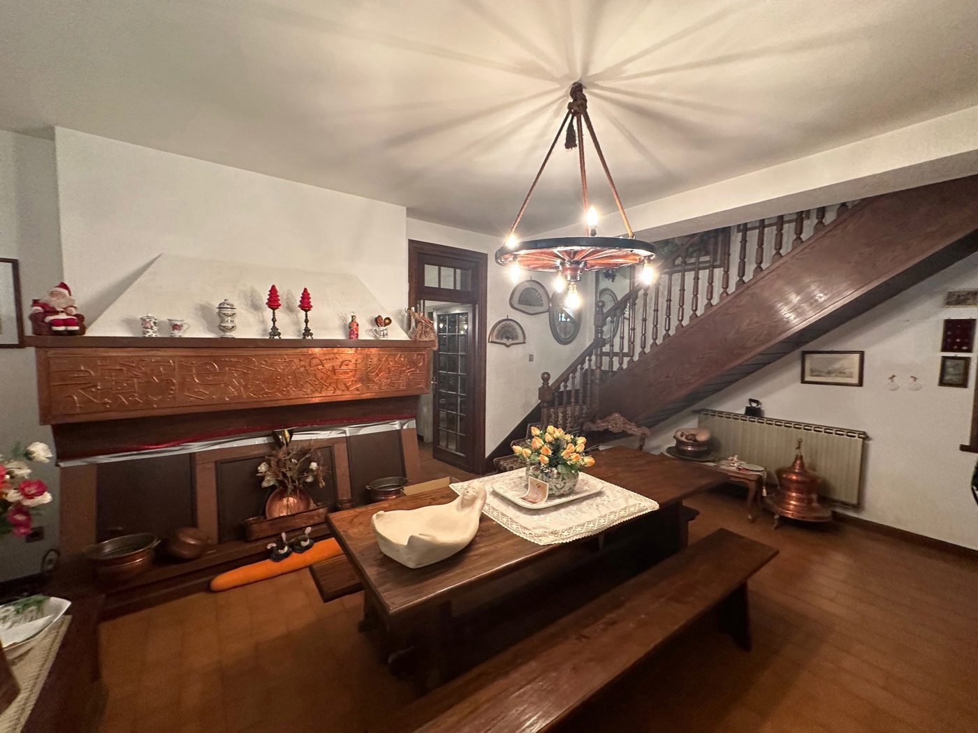 Si accede in unampia ed accogliente zona living caratterizzata da uno spettacolare camino con decorazione di rame incisa a mano, ampia finestra panoramica e da una scala in legno costruita da un artigiano locale che consente laccesso al piano superiore (zona notte). Al piano terra situata una cucina abitabile con un secondo camino in pietra, attualmente rivestita in legno, un ulteriore salone/camera/studio con bagno di servizio al piano con finestra.