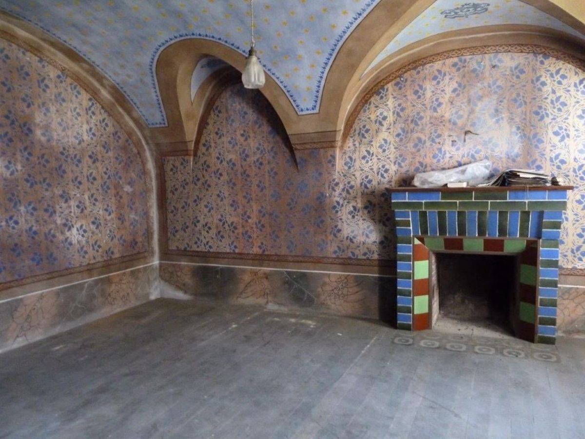 Pareti e soffitti con dipinti e decori d'epoca, grande camino tradizionale, pavimentazioni in pietra e legno.