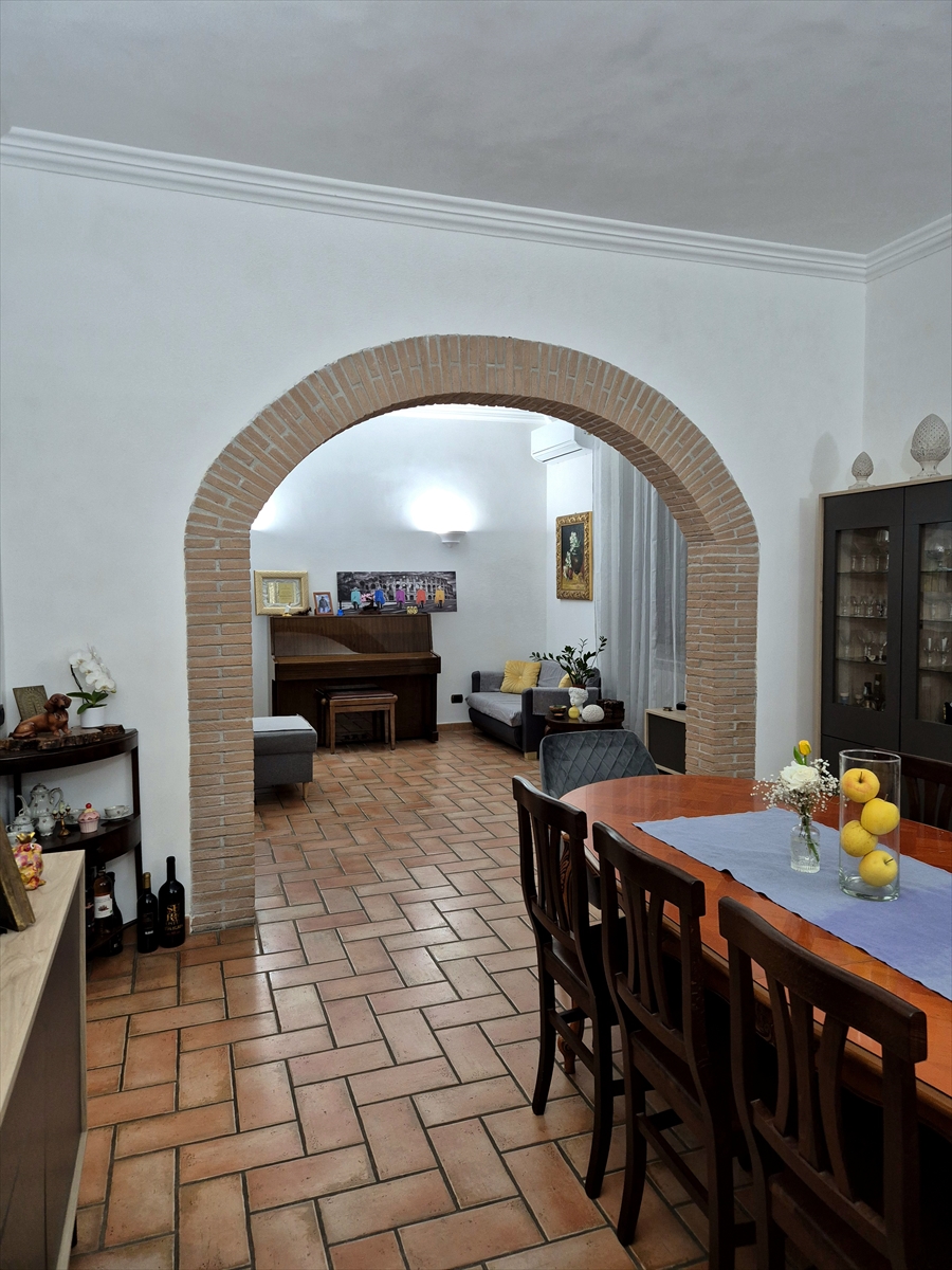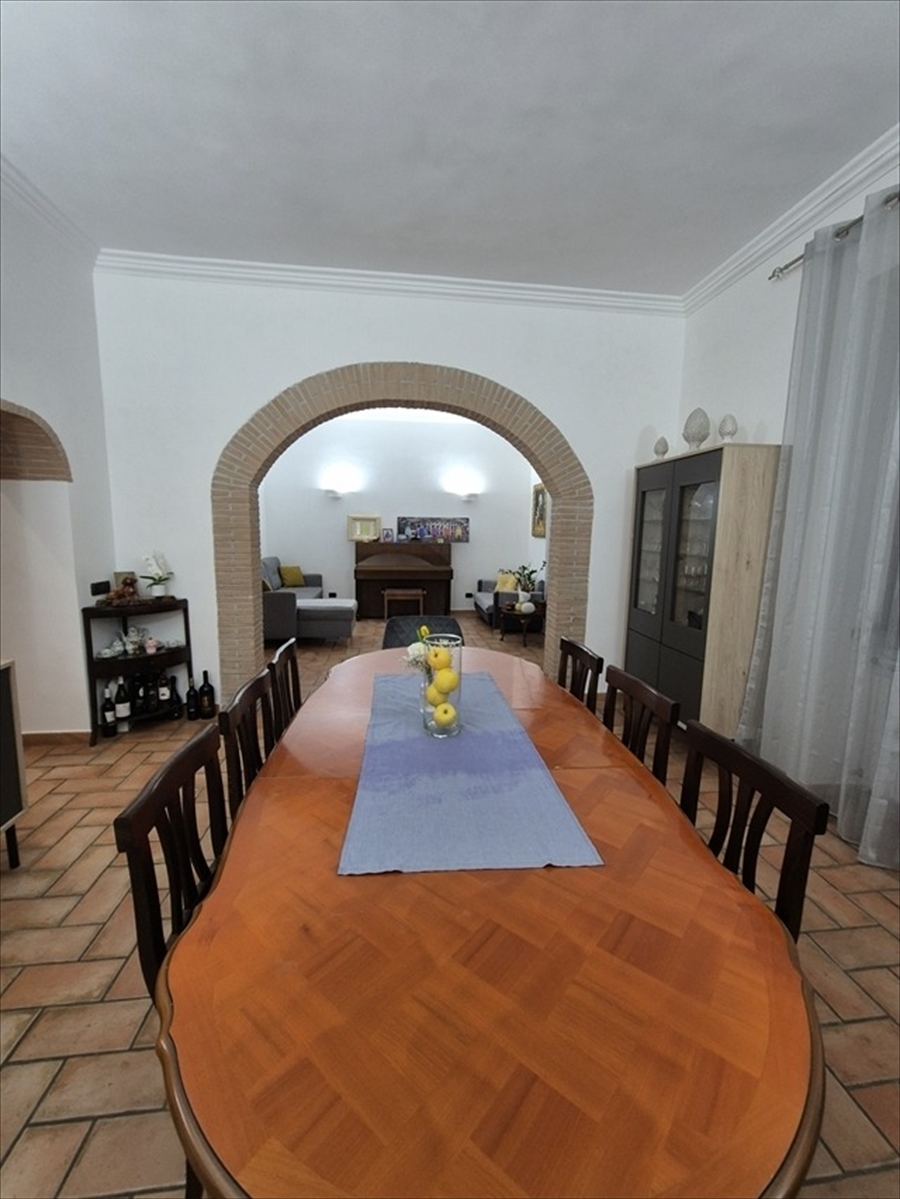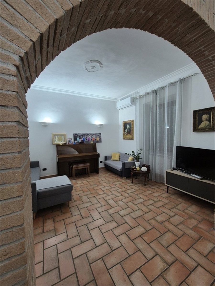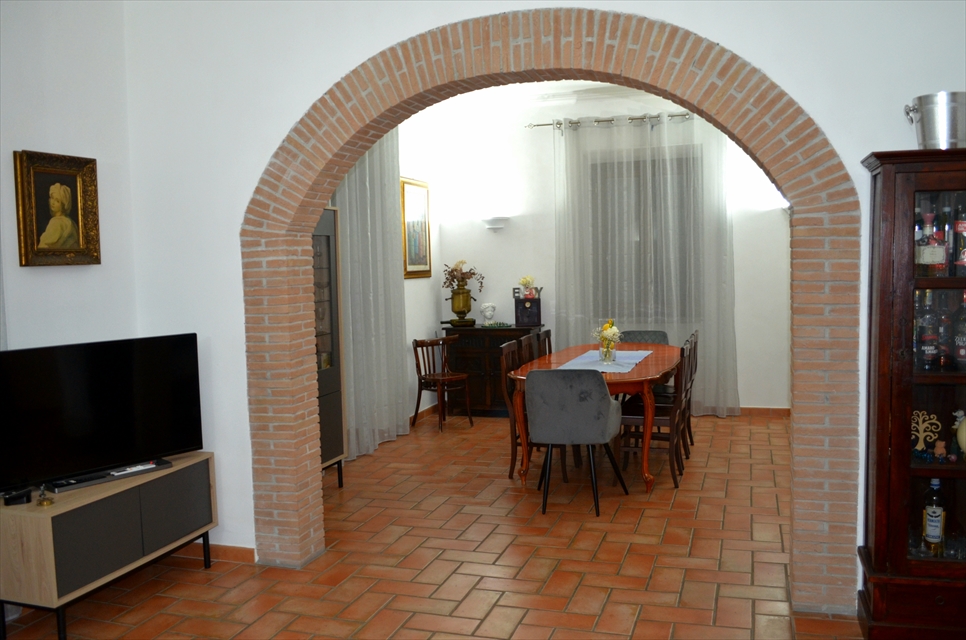 La zona giorno, al piano terra, accoglie gli ospiti con un ingresso dimpatto, impreziosito da eleganti archi, che conduce a una cucina ampia e funzionale, a un salone doppio di grande rappresentanza e a un bagno con doccia.