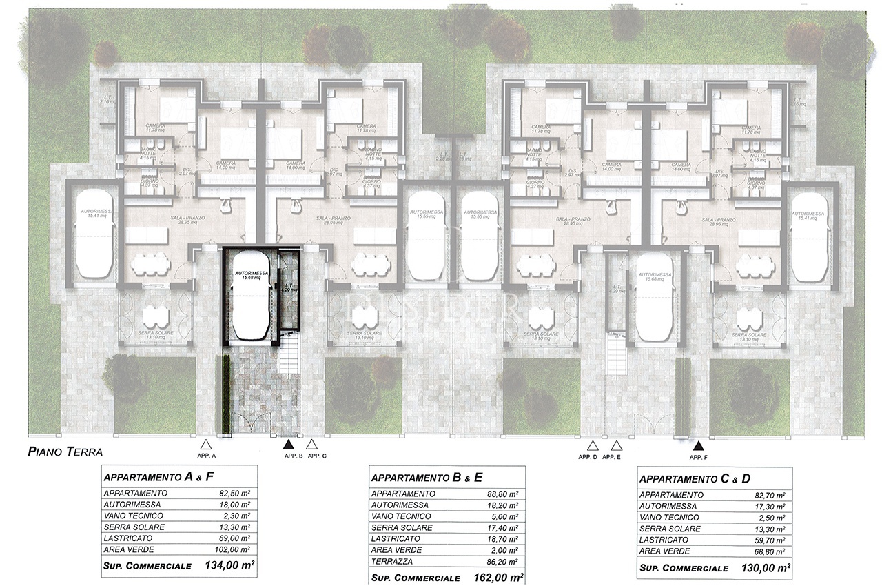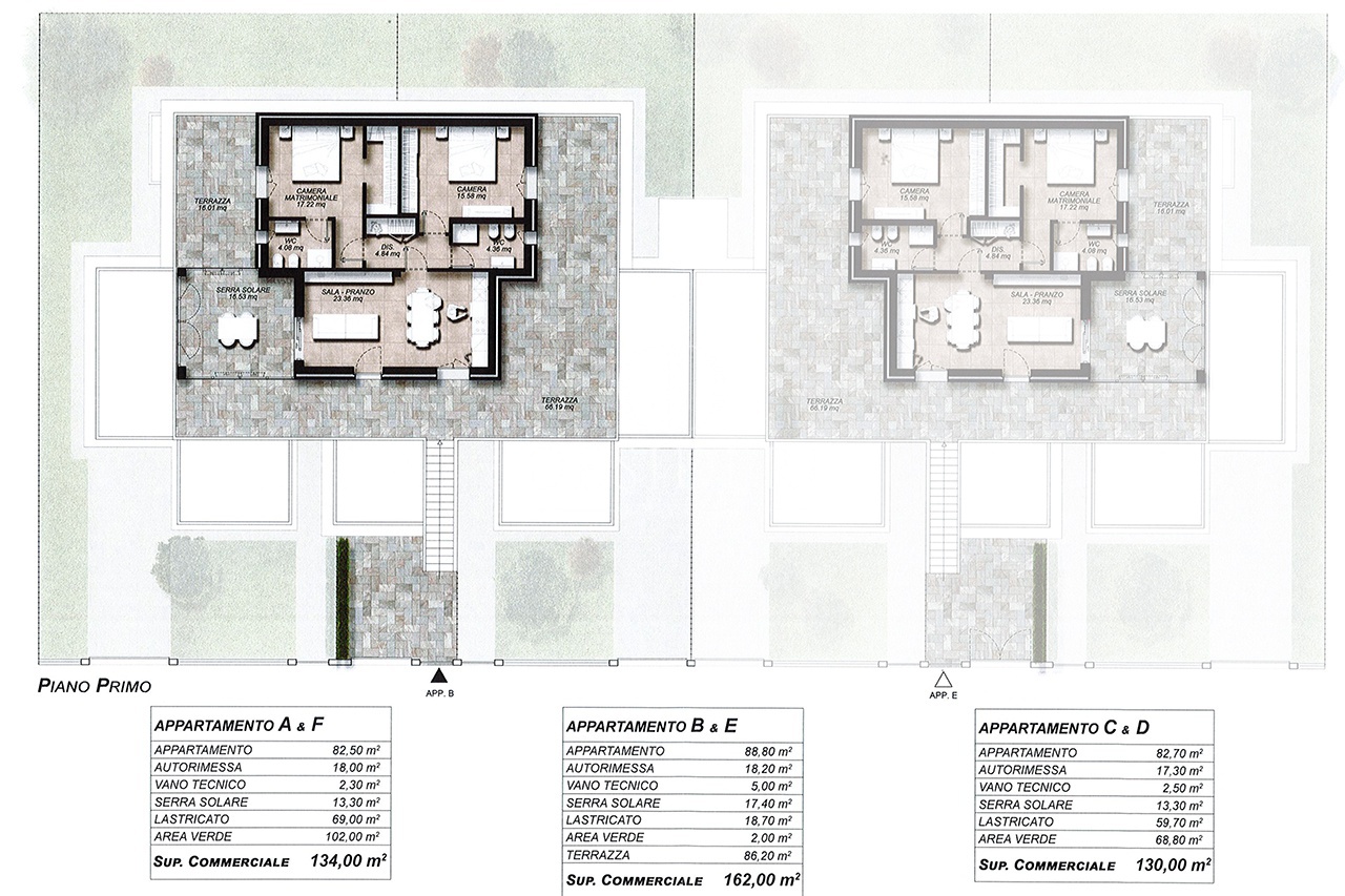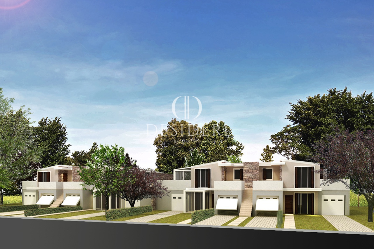 Ogni appartamento all'interno della schiera di trifamiliare, è concepito tutto su di un unico livello circondato da 86 mq di terrazza.