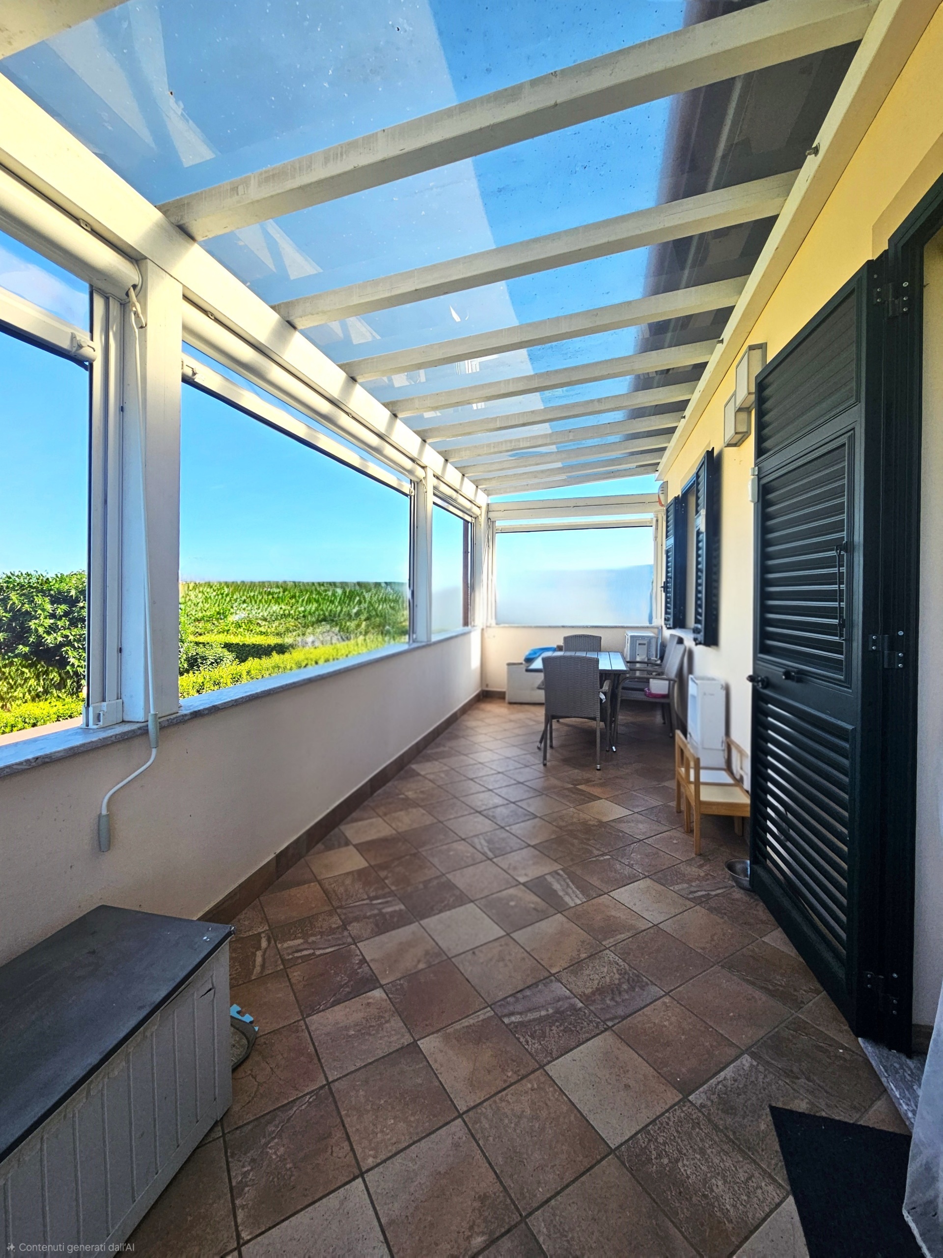 L'abitazione è così composta: ingresso tramite scala esterna privata, ampia terrazza con copertura e chiusura laterale in plexiglass, soggiorno con angolo cottura, disimpegno, camera matrimoniale, camera singola, bagno finestrato con doccia e angolo armadi/lavatrice.