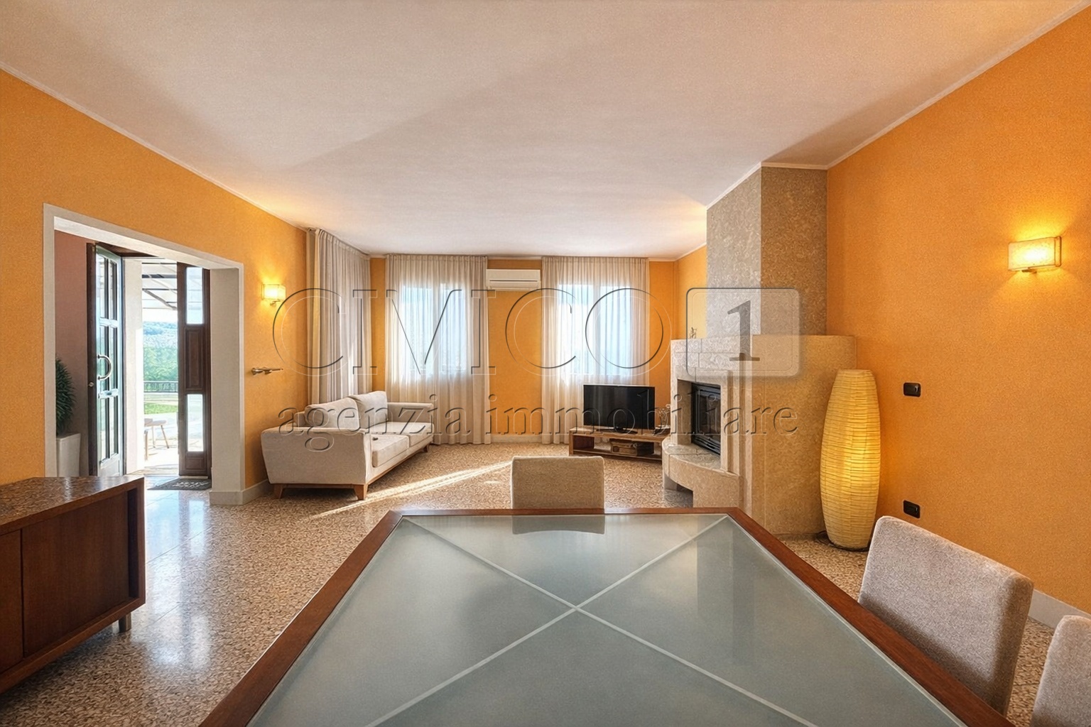 Appena entri nella tua nuova casa vieni accolto da una zona giorno luminosa ed elegante arredata di un grande termo camino e impreziosita da una splendida veneziana che regala stile e personalita agli ambienti.