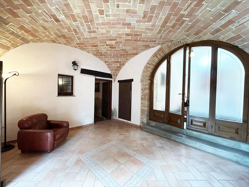 Dalla Via Roma, con un portone in legno massello si accede ad un atrio interno che comunica ai due appartamenti: a) appartamento di mq. 180 al piano terra composto da 7 vani più accessori, con annessa corte esclusiva di circa mq. 700 in parte pavimentata ed in parte a giardino, oltre ad una cucina rustica esterna; questa unità abitativa è caratterizzata dai solai con volte a mattoni che rendono gli ambienti unici e particolari; b) appartamento di mq. 190 al piano primo composto da 7 vani, corridoio, bagno e terrazzo.