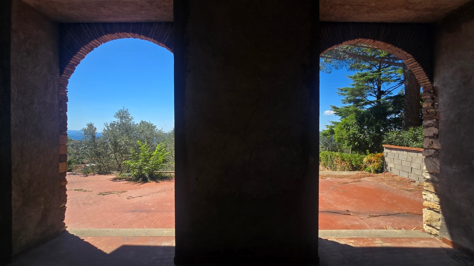 Piano seminterrato con giardino Al piano inferiore (piano terra/seminterrato) con ingresso indipendente dal vicolo e con la predisposizione per una scala interna, si trovano due locali allo stato grezzo (circa 130 mq) e un locale tecnico, un portico,e uno spazio esterno di 450 mq, in parte pavimentato (da ripristinare) e, ad un livello inferiore, un giardino con ulivi.