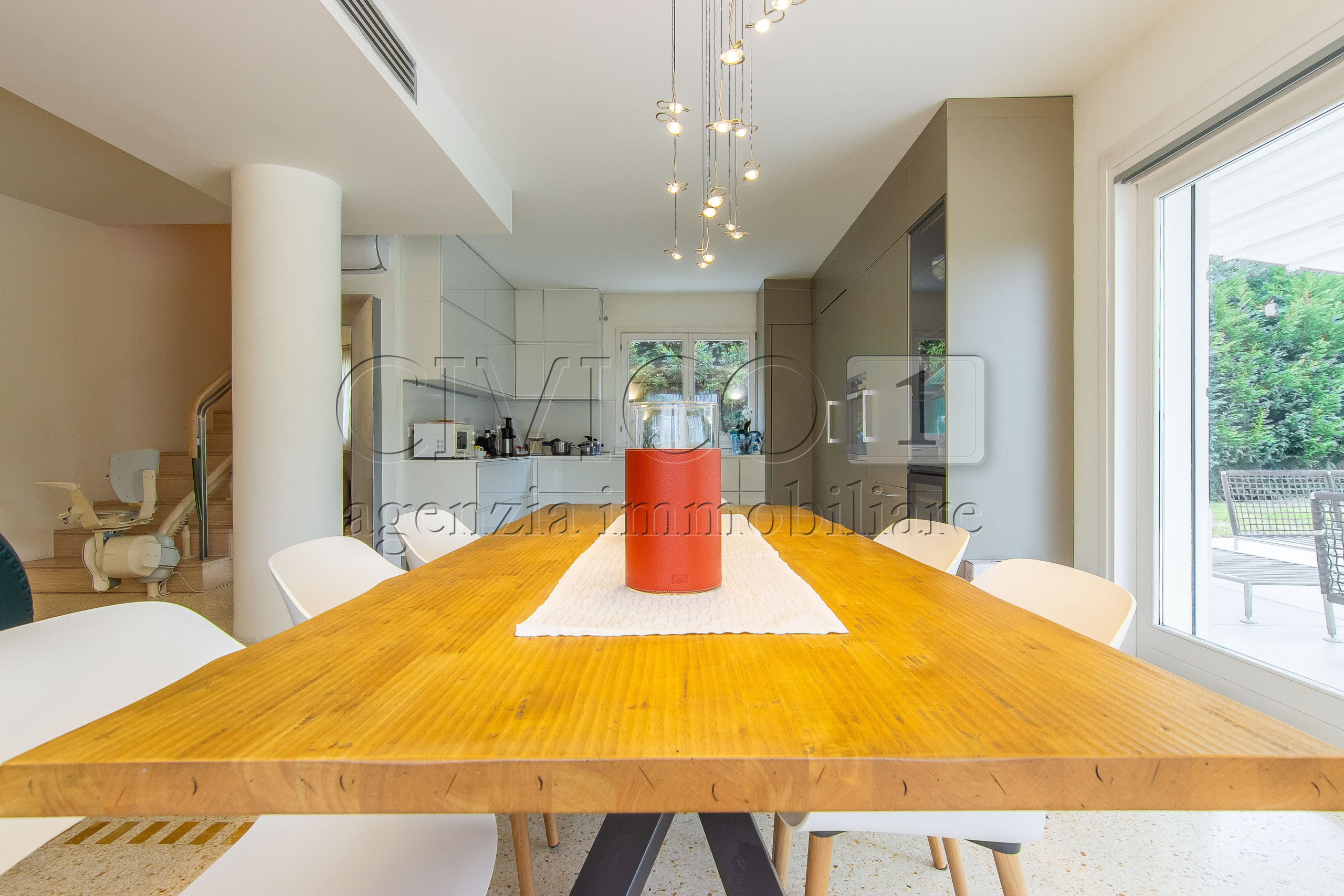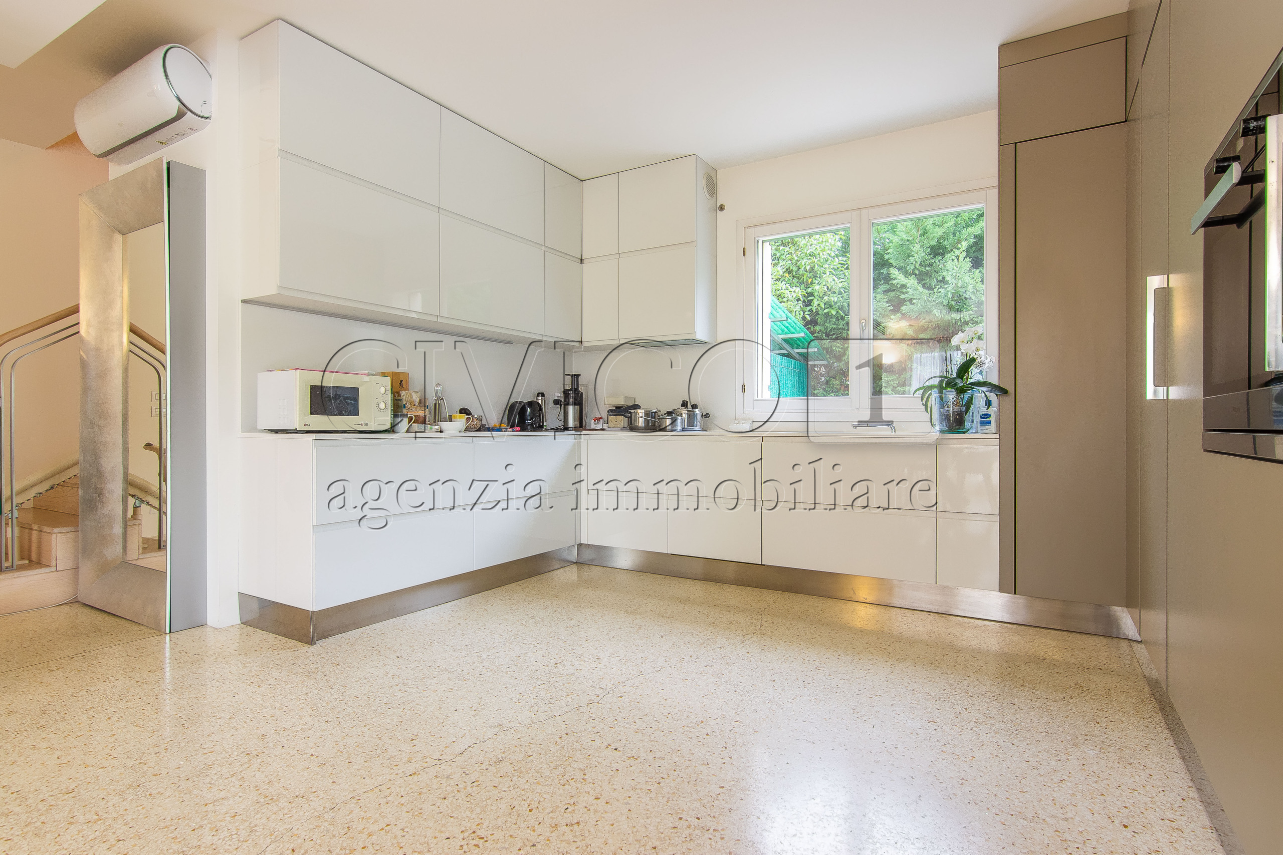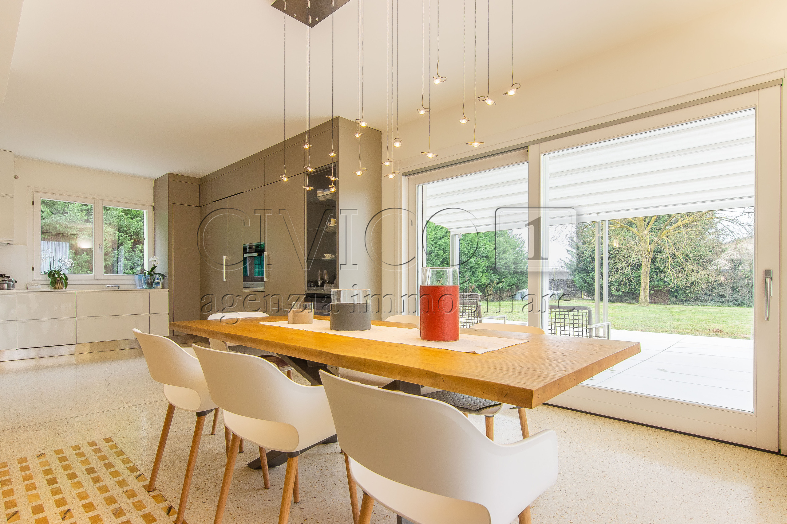 Allesterno, la proprietà si apre come unestensione naturale degli interni: il giardino privato, ampio e perfettamente curato, ospita un elegante dehors coperto da pompeiana, affacciato su un parco riservato che regala profondità visiva e assoluta privacy.