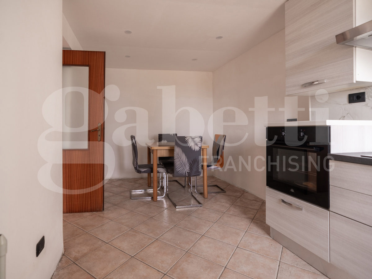 Accanto, una cucina abitabile pensata per le cene in famiglia e i momenti condivisi, un bagno con doccia, una cantina e il locale tecnico con caldaia a pellet completano il piano terra.