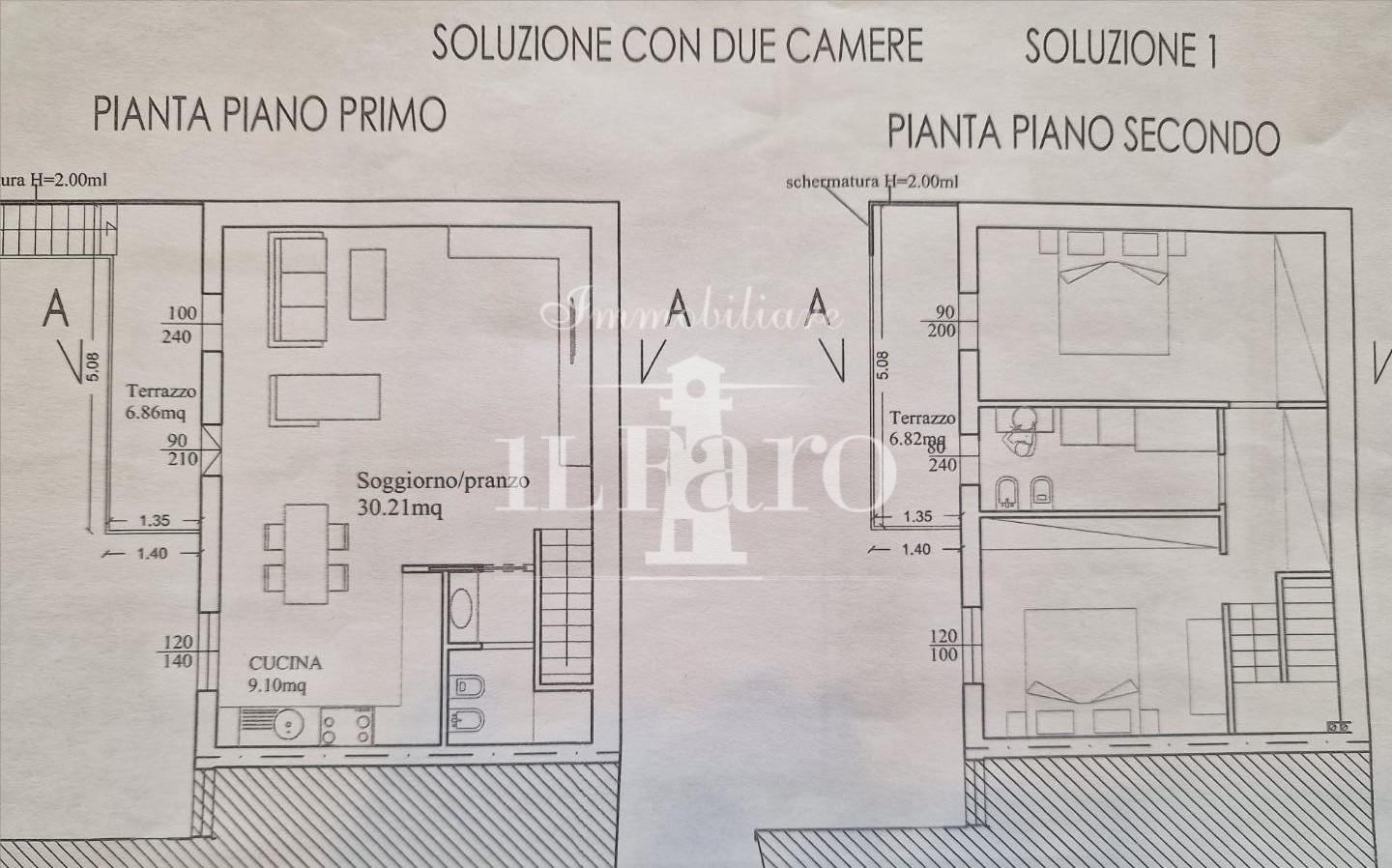 Al piano primo ci accoglie una bella zona giorno con angolo cottura collegata alla terrazza (possibilità di avere anche la cucina separata a piacimento del cliente), una cameretta e un bagno non finestrato.