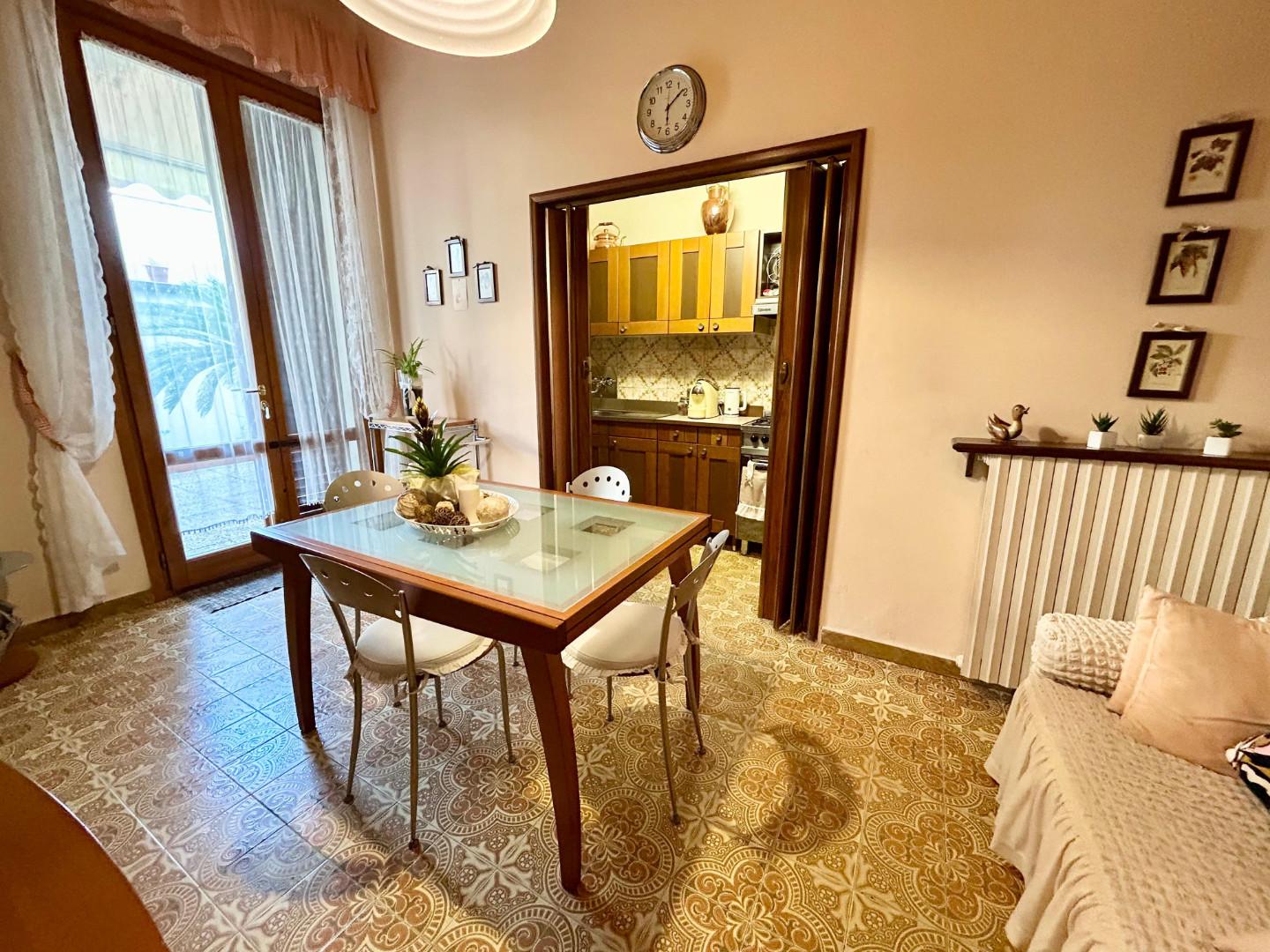 Labitazione si apre su un ampio ingresso, seguito da un luminoso salotto, una cucina abitabile con adiacente cucinotto, e un pratico bagno di servizio/ripostiglio.