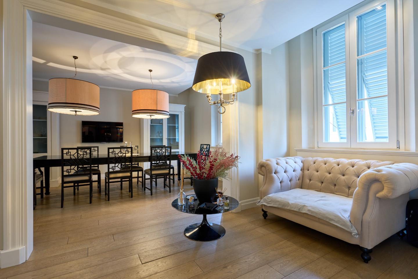 Gli ambienti sono luminosi e ben proporzionati, valorizzati dal parquet e dalle ampie aperture.