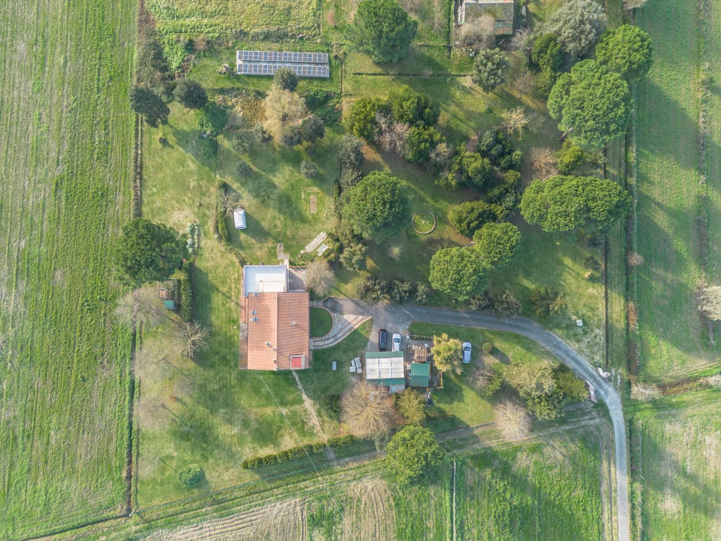Composizione Piano Terreno: Zona living con camino e cucina open space, tre camere, ulteriore zona living, tre servizi e doppio loggiato Composizione Piano Primo: Soggiorno con camino, cucina abitabile, tre camere, doppi servizi e terrazza di circa 45 mq. Spazi Esterni Il grande giardino privato circonda la casa, offrendo uno spazio ideale per: - relax - area solarium - pranzi allaperto - spazio per animali - eventuale piscina - Locale magazzino esterno di 62 mq Un vero valore aggiunto, raro da trovare in una zona così servita.