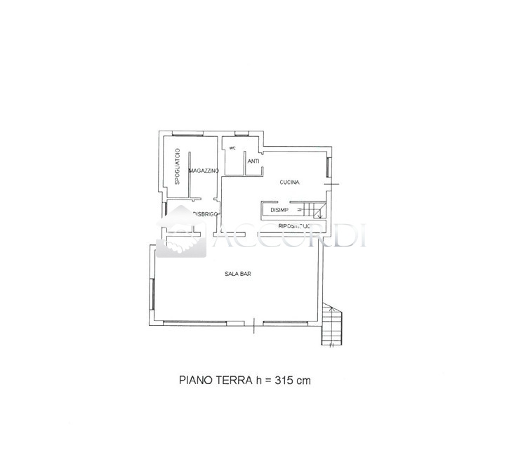Al piano terra si trova il locale destinato al bar, con cucina, spogliatoio, magazzino e servizi separati per clienti e personale.