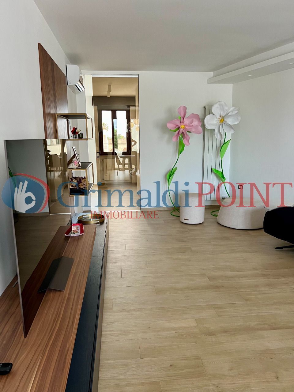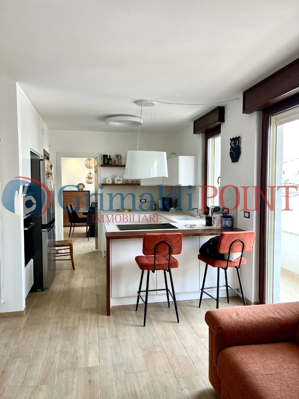 INTERNO: Lingresso principale si apre su un disimpegno che conduce a un luminoso soggiorno e a una cucina moderna, entrambi con affaccio su un balcone.