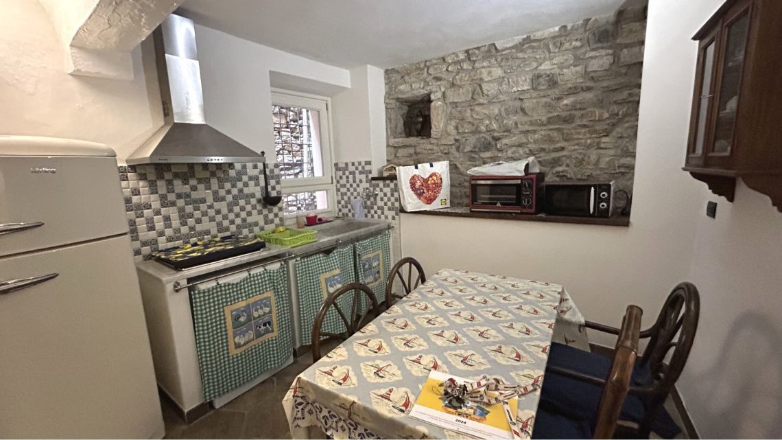 Gli interni: Piano terra: ingresso indipendente su corte piastrellata vivibile; ampio open space con cucina in muratura, soggiorno e sala con pareti in pietra a vista; camera matrimoniale e bagno finestrato con doccia.