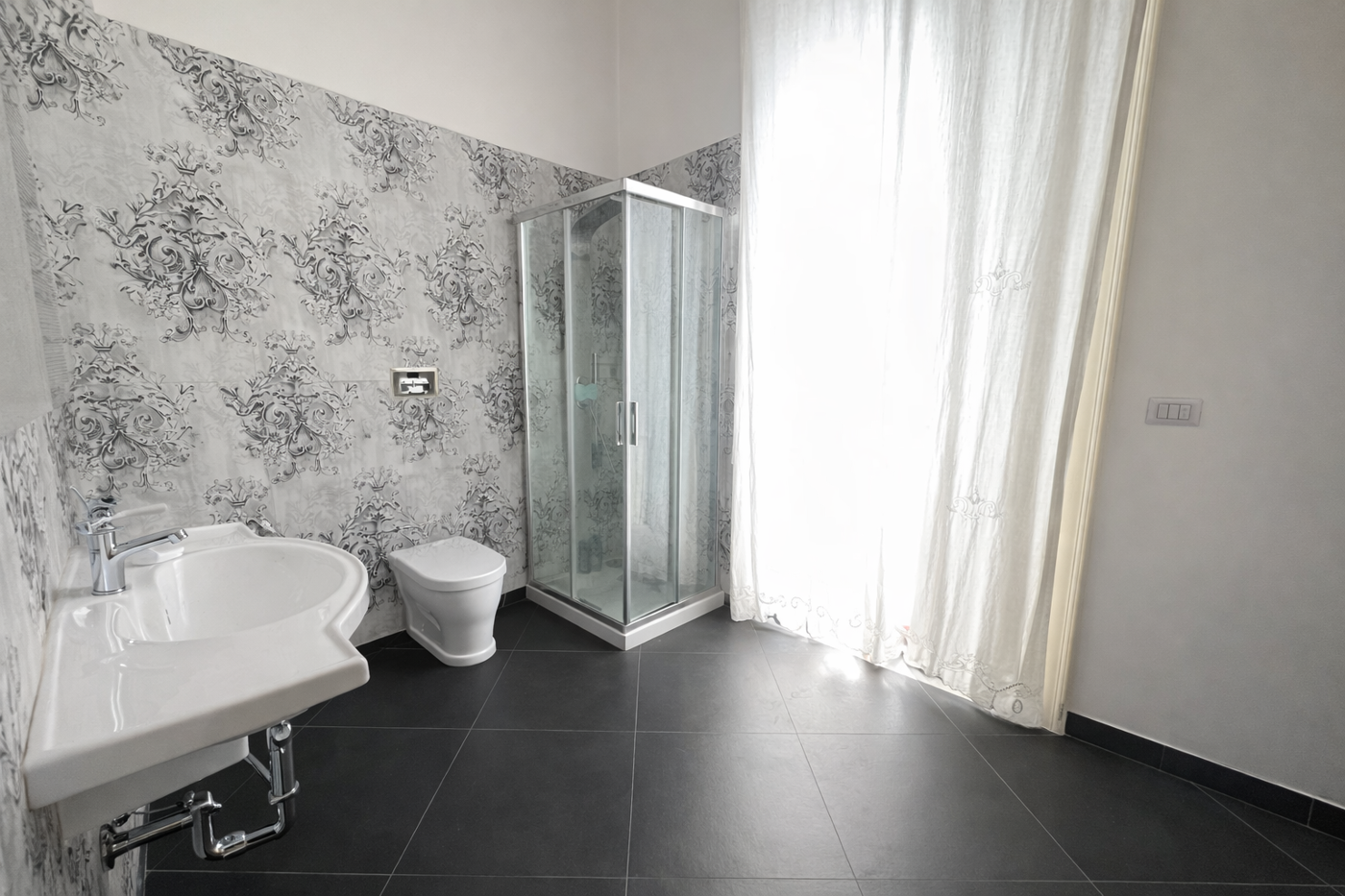 Salendo al primo piano si apre una zona abitativa luminosa e articolata, composta da ingresso, salone, due ampie camere da letto, cabina armadio, cucina abitabile, doppi servizi e un piacevole terrazzino a livello, completato da balconi che affacciano sia su Via Garibaldi sia su Via Curcio.