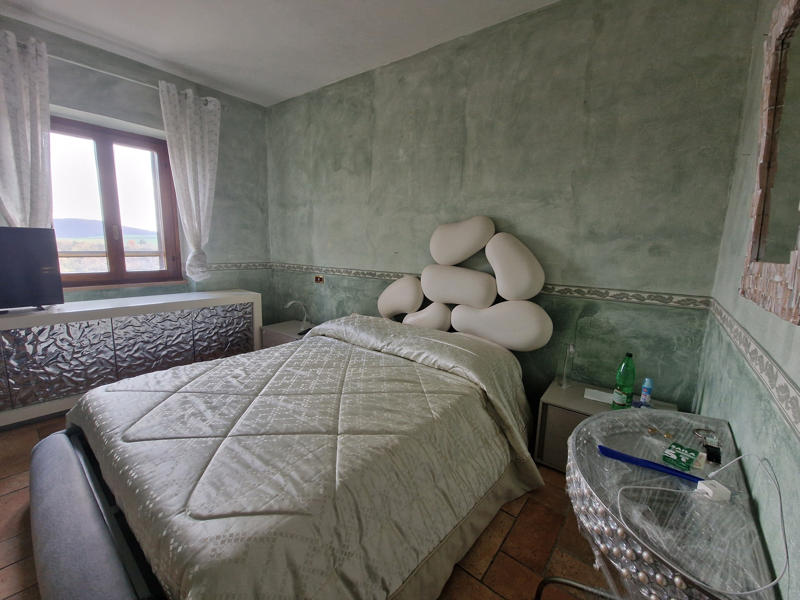 Le due camere da letto offrono una vista panoramica sulle colline circostanti, mentre il bagno è dotato di una comoda doccia.