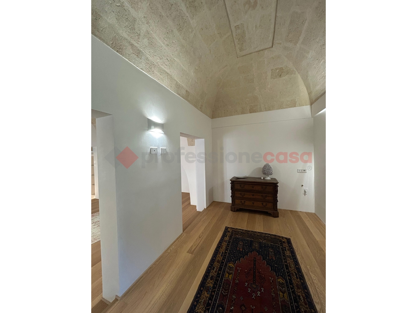 Da qui si accede alla zona living, impreziosita da splendide volte a stella doppia, anchesse con faccia a vista, che donano calore e carattere agli ambienti.