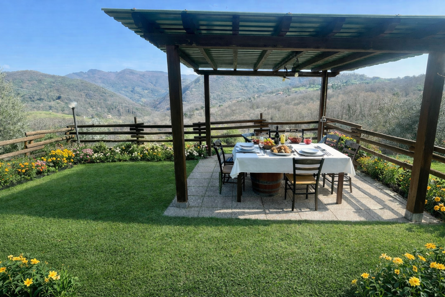 Adiacente allabitazione si trova un terrazzamento con pergola, perfetto per pranzi e cene allaperto, con affaccio sulla piscina privata in muratura.