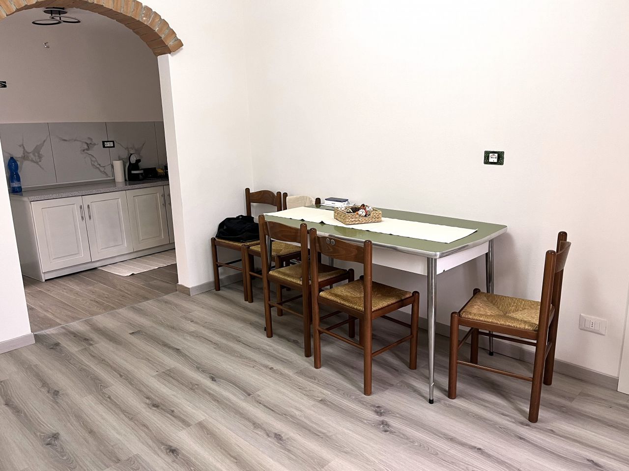 L'Immobile La soluzione si apre su un accogliente ingresso che conduce alla zona giorno, composta da una sala da pranzo già arredata con tavolo e quattro sedie.