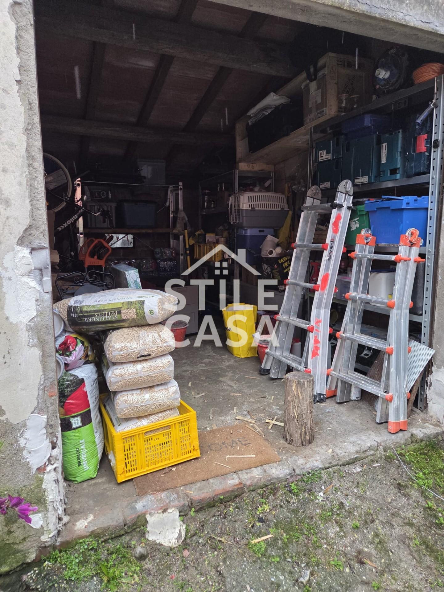 A corredo garage fronte casa di circa 18 mq per posto auto e in parte uso magazzino x ricovero attrezzi . L'immobile è dotato di infissi in legno in doppio vetro + persiane in alluminio e zanzariere oltre a due stufe a pellet su ogni piano oltre a metano già allacciato, acquedotto e tricamerale per le fognature.