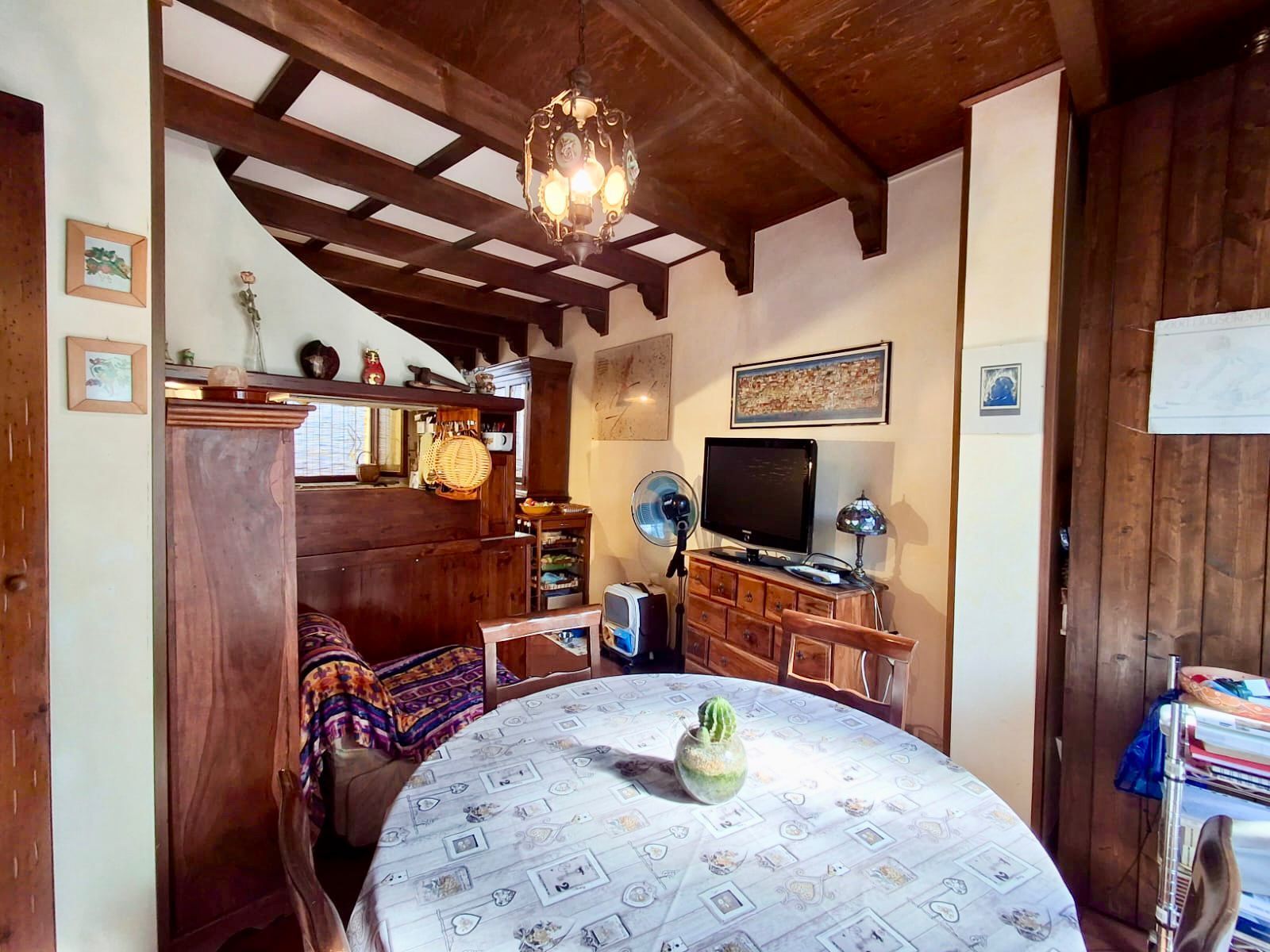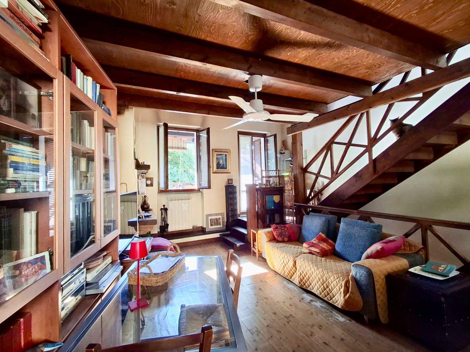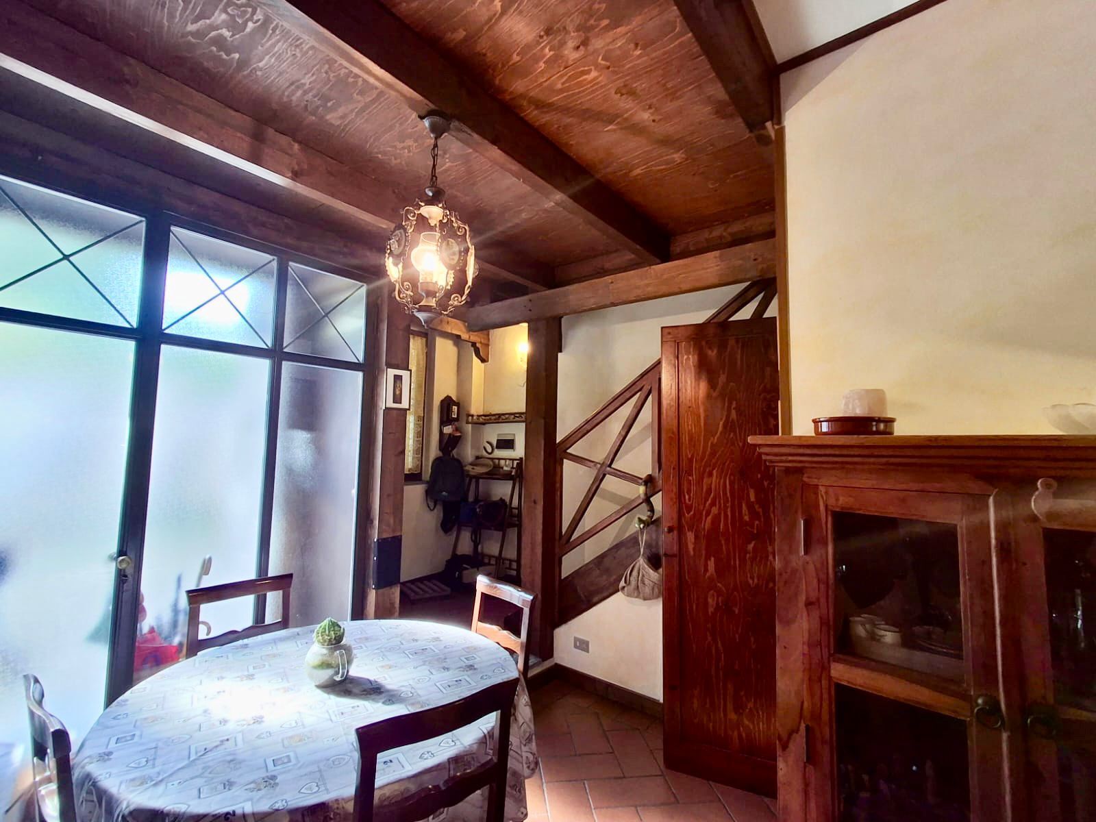 Salendo la scala in legno, si accede al primo piano, che ospita un luminoso salone con camino, arricchito da un balcone in legno affacciato sullinterno della corte, perfetto per godere della quiete del contesto.