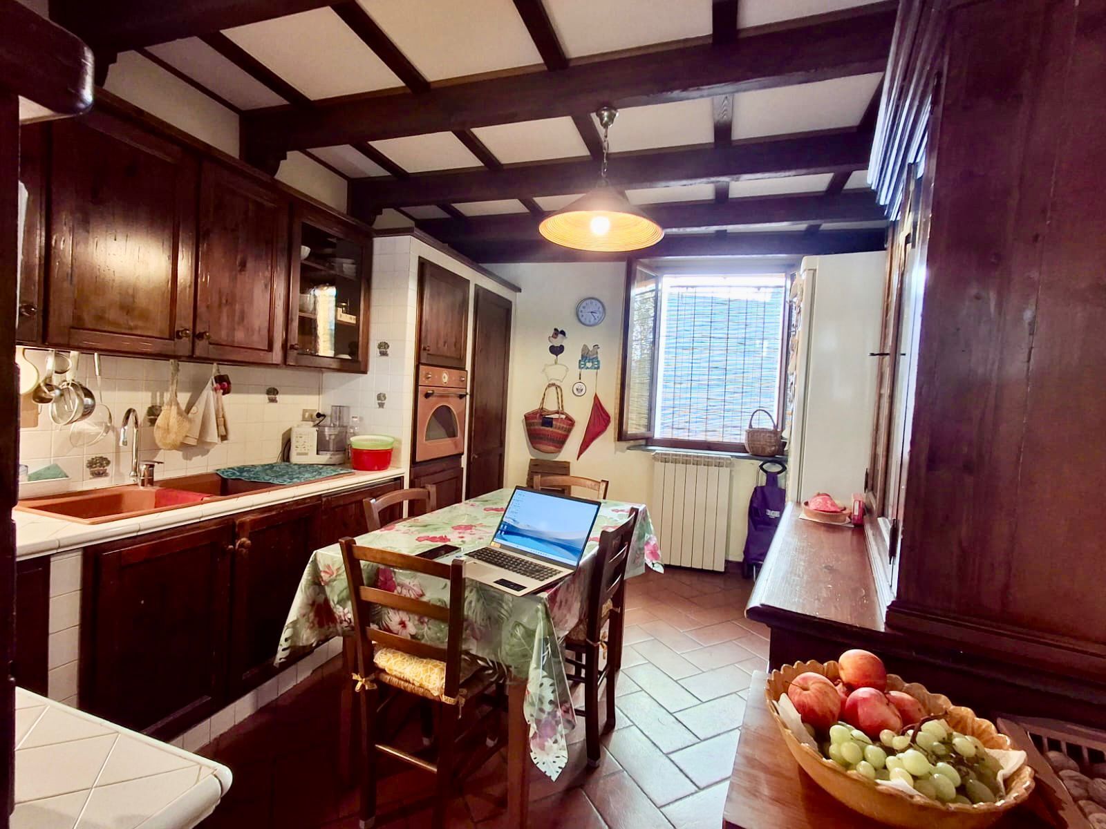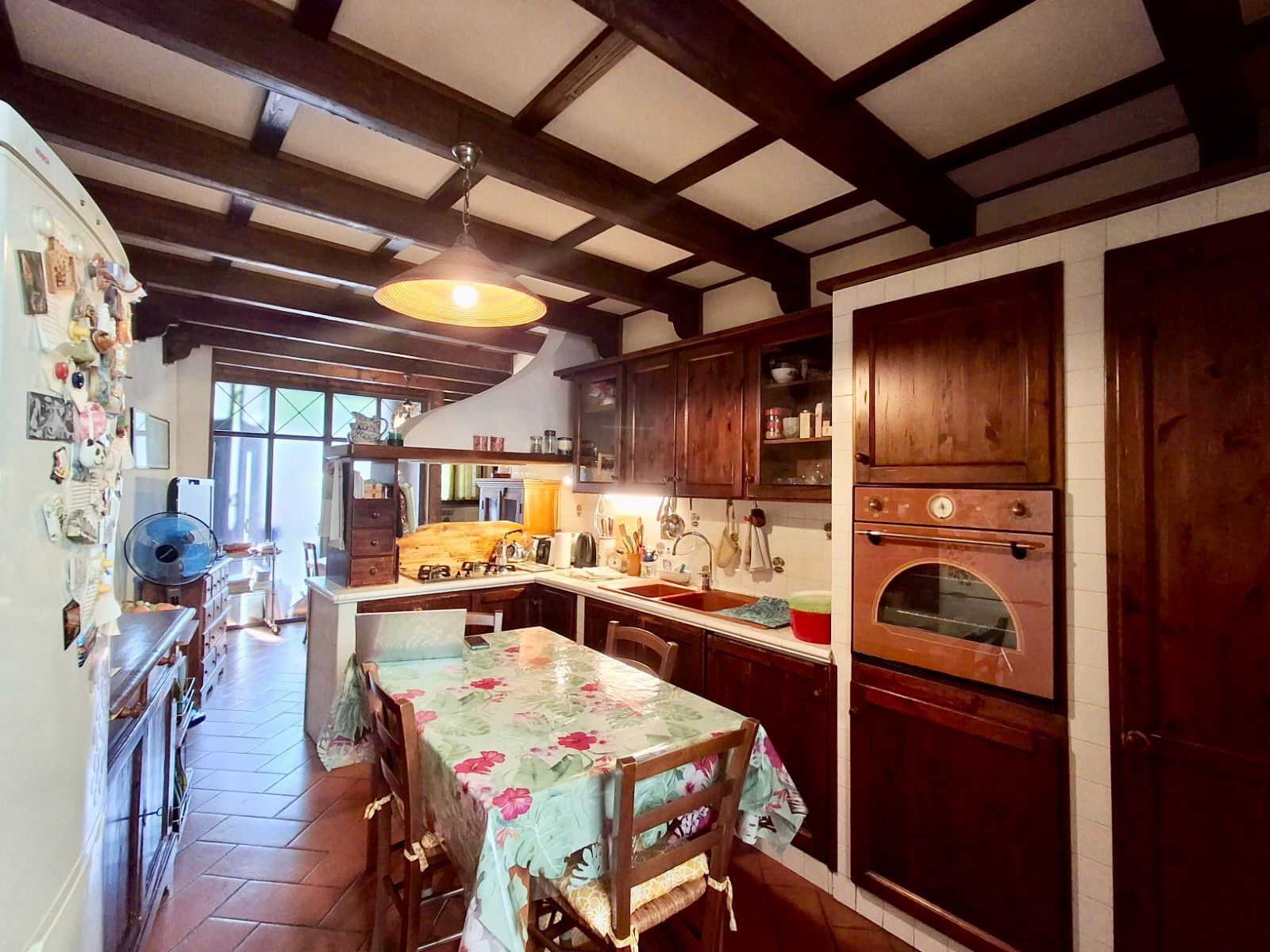 Lingresso si apre sul piano terra, dove si sviluppa una spaziosa cucina abitabile con sala da pranzo annessa.