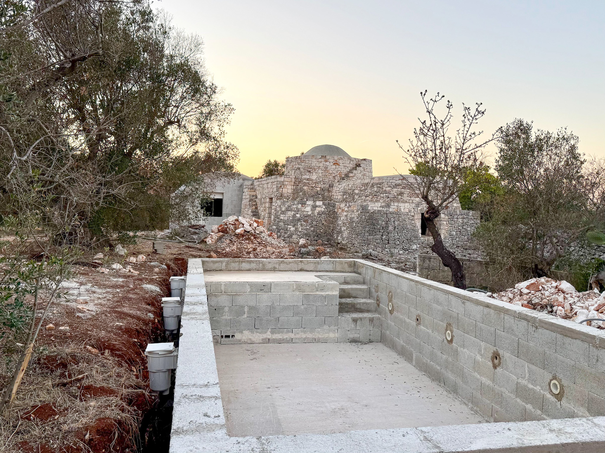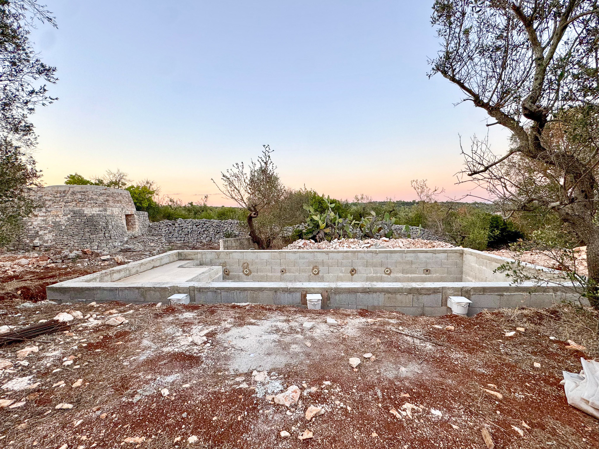 Elemento di assoluto prestigio è la piscina a sfioro con effetto infinity, lunga circa 40 metri, già realizzata nella sua struttura portante e progettata con locale tecnico, vasca di compensazione e area solarium pavimentata.