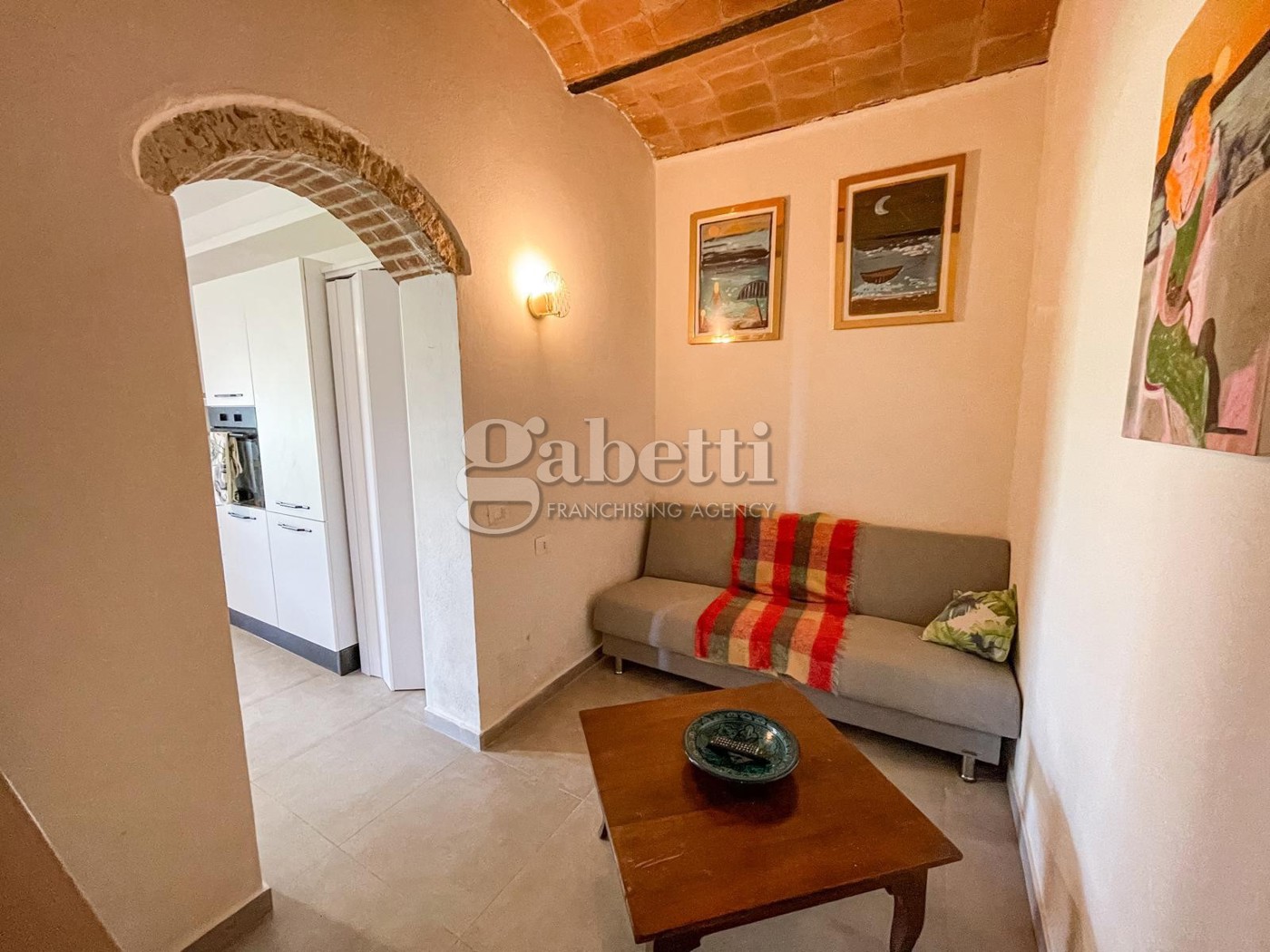 L'interno caratterizzato da una zona giorno luminosa con cucina a vista, una piccola stanza versatile da utilizzare come salottino o studio, e un disimpegno che conduce alla zona notte.