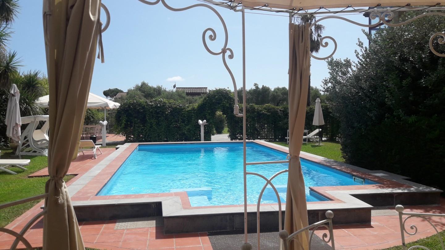 ? Spazi esterni da sogno: patio coperto per pranzi allaperto, piscina con idromassaggio, bagno esterno con doccia calda, cucina esterna in marmo bianco di Carrara, con barbecue e tavolo per 10 persone, gazebo ombreggiato con secondo tavolo da 14 posti, il tutto circondato da ulivi e palmizi secolari che donano charme e riservatezza.