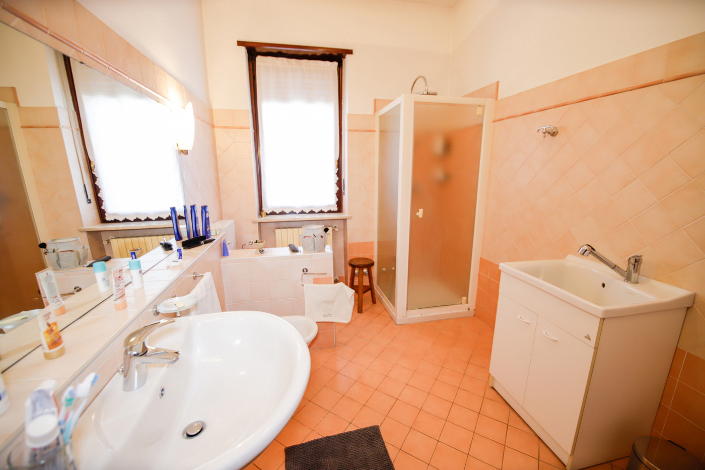 Il piano terra caratterizzato da un ampio e luminoso salone doppio con camino, una cucina abitabile, una camera, una cameretta e un bagno con box doccia.
