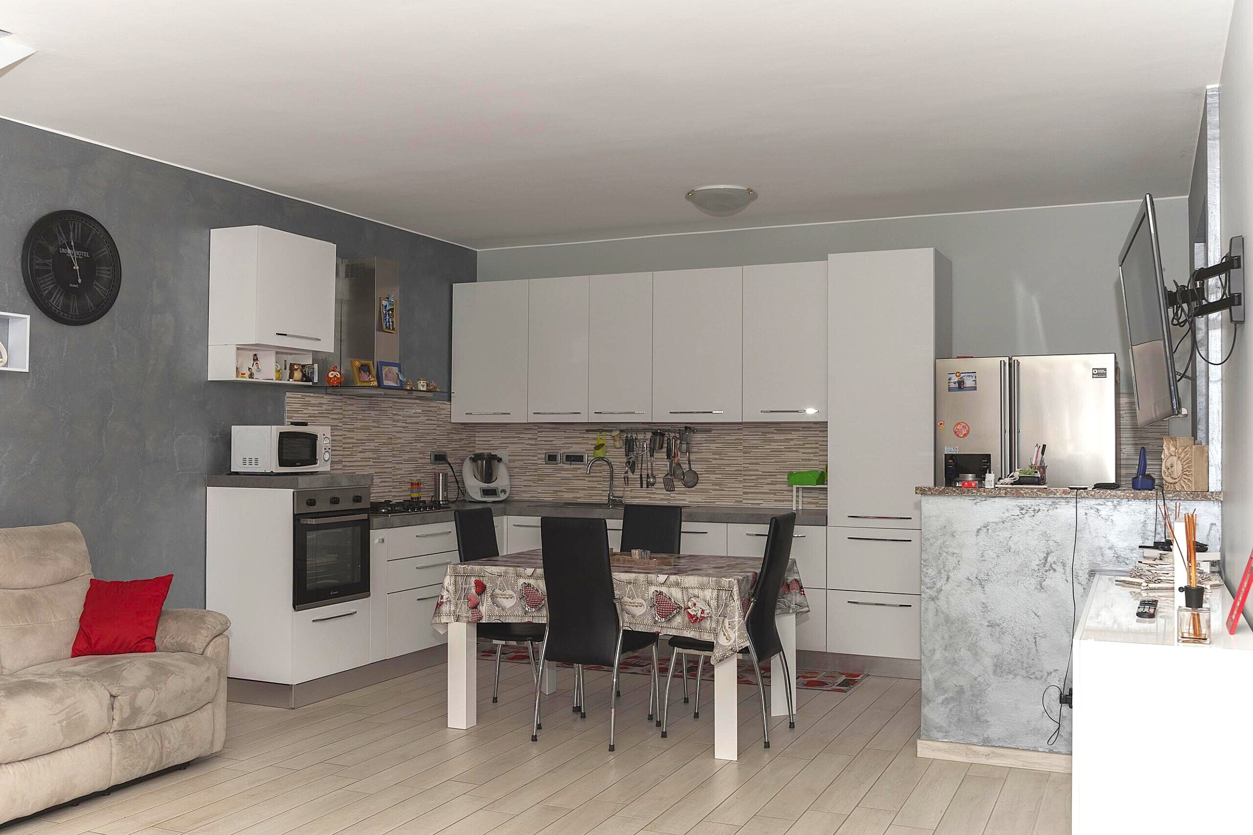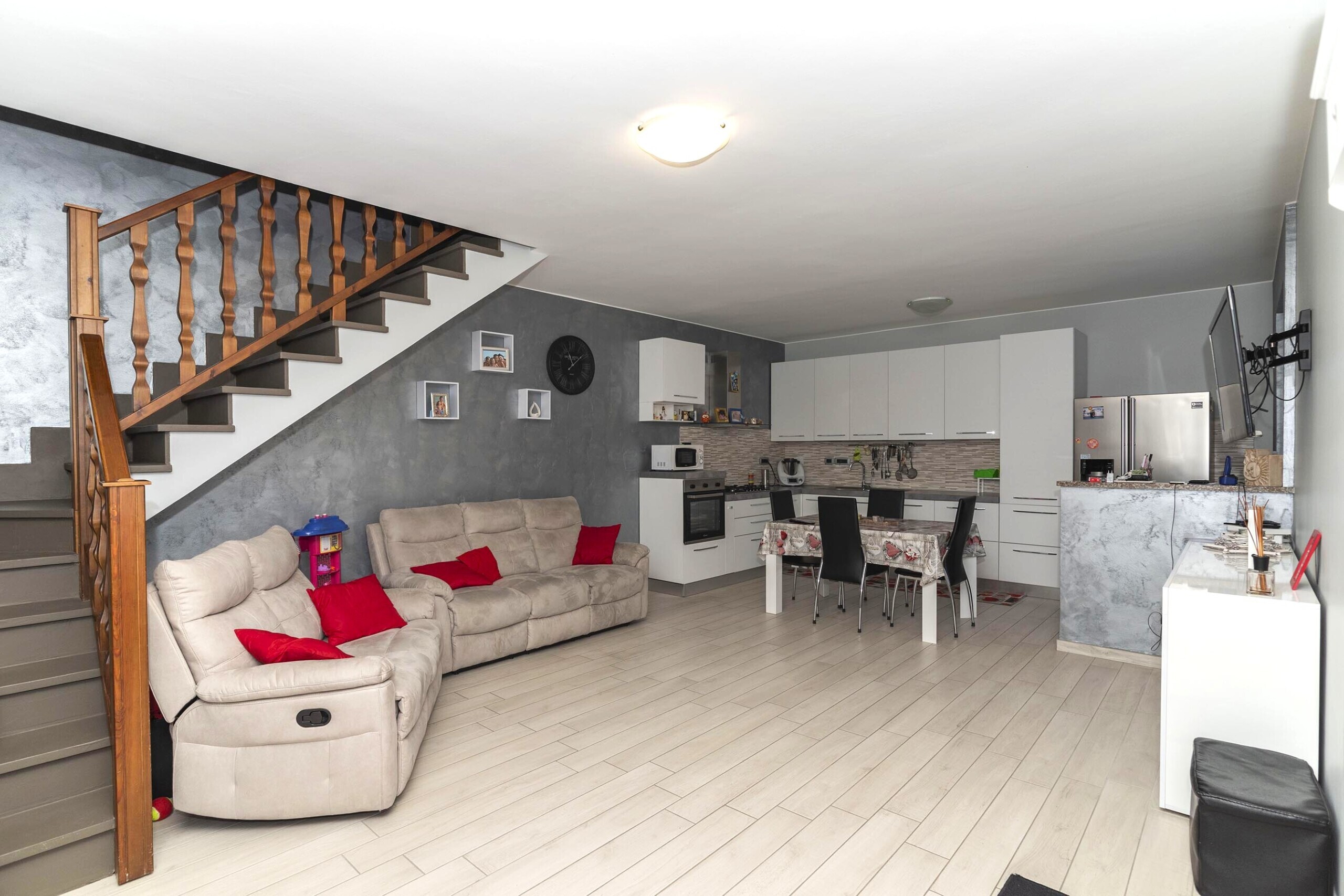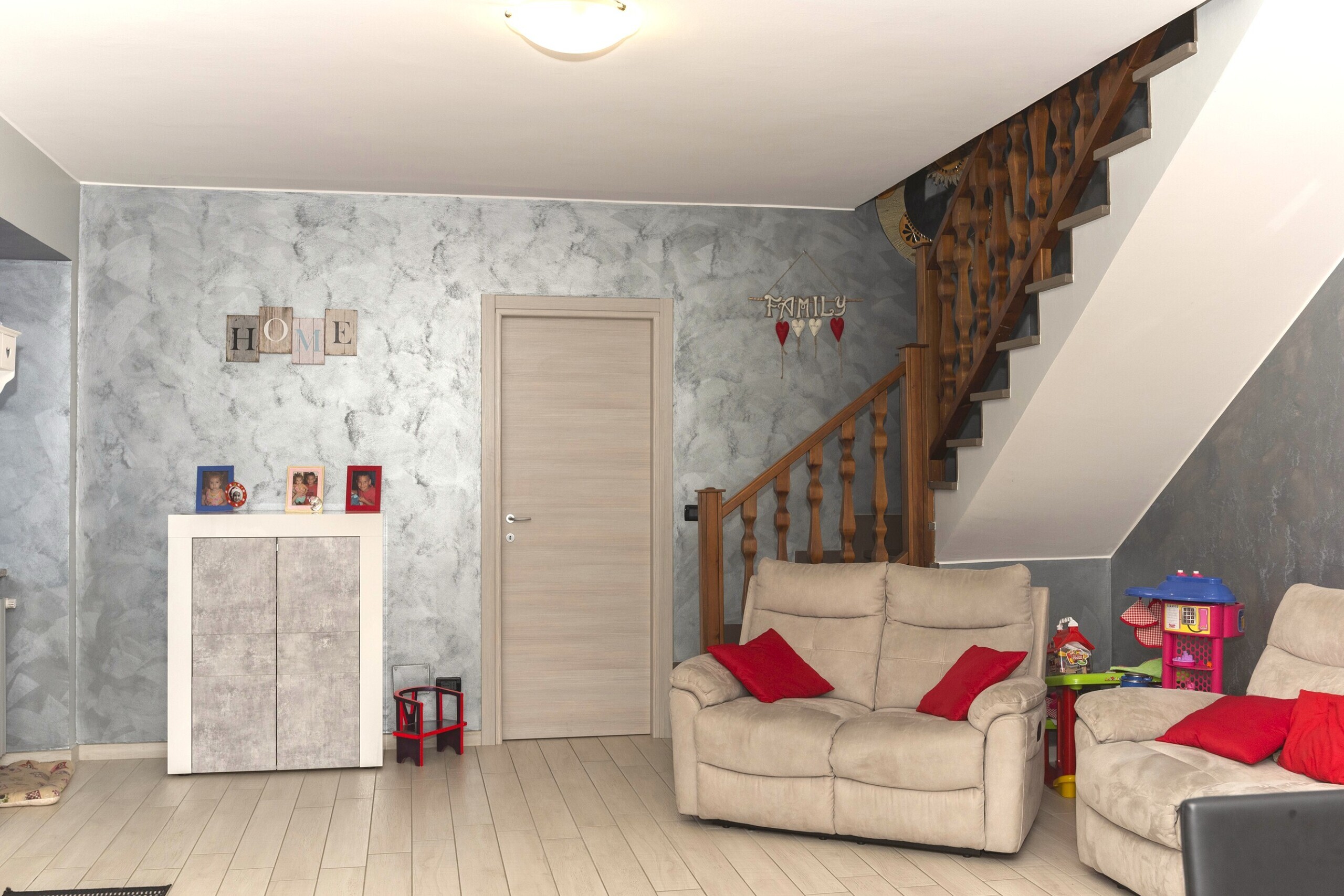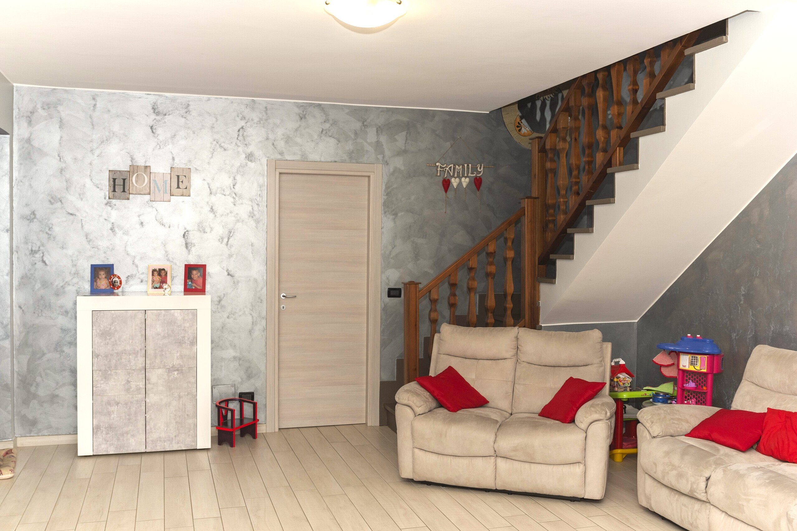 La porta di ingresso apre sull'accogliente zona giorno composta da zona soggiorno con parete tv e cucina a vista, questo ambiente di notevoli dimensioni può ospitare diverse persone e affaccia sul primo pezzo di area privata esterna, sempre sul piano troviamo il bagno di serizio con annessa lavanderia e la scala interna che conduce al piano superiore dove è presente la zona notte.
