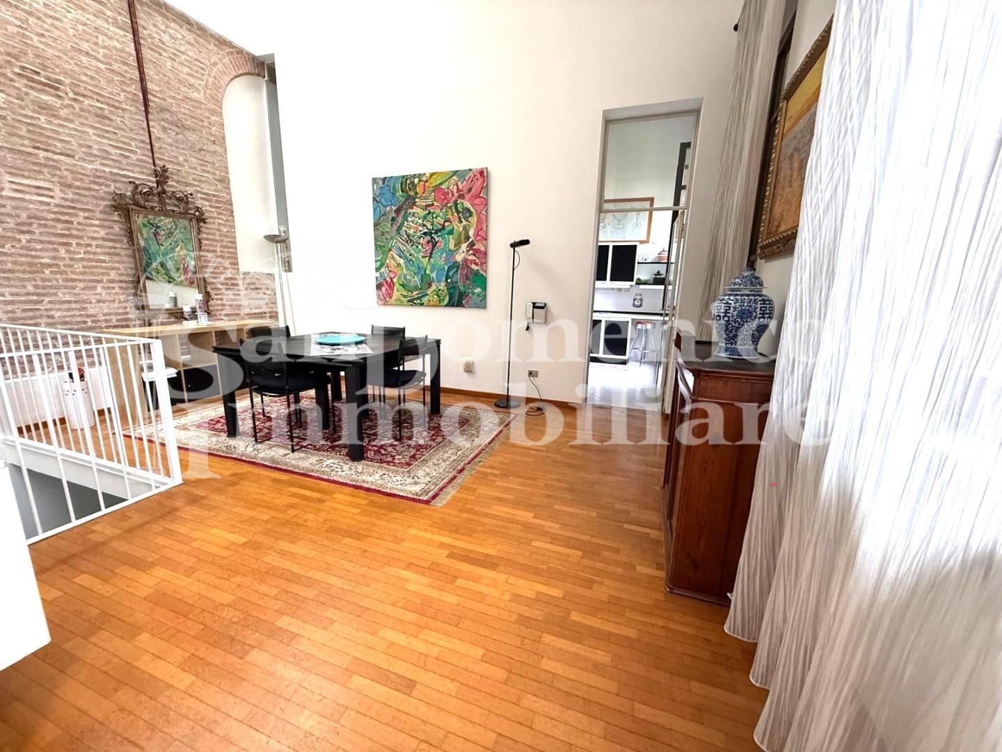 Attraverso l'accesso da scala privata, arriviamo all'ingresso che si apre su un ampio salone doppio, suddiviso in zona living e zona pranzo, la cucina abitabile è dotata di soppalco, ideale come dispensa o spazio aggiuntivo.
