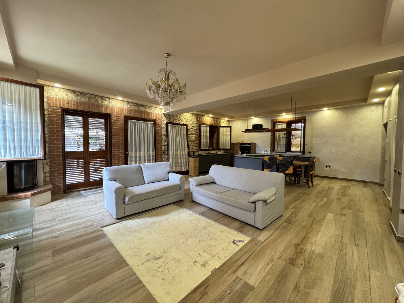 Il piano terra stato recentemente ristrutturato e si presenta accogliente e funzionale: entrando si viene accolti da una luminosa zona giorno open space, ampia e ben distribuita, che unisce cucina e soggiorno in un unico ambiente conviviale e moderno.