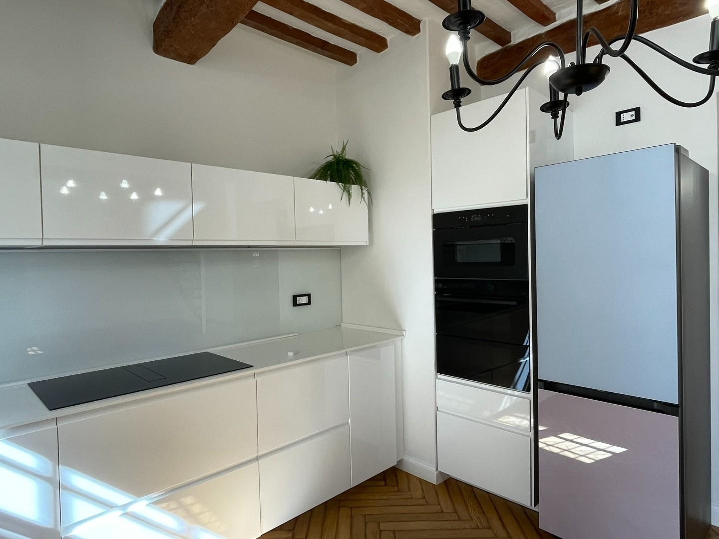 La recente ristrutturazione ha sapientemente conservato i soffitti con travi e travicelli in legno, creando un'atmosfera calda che si integra perfettamente con elementi più moderni, come le scale in metallo e legno e i pavimenti in parquet a spiga.
