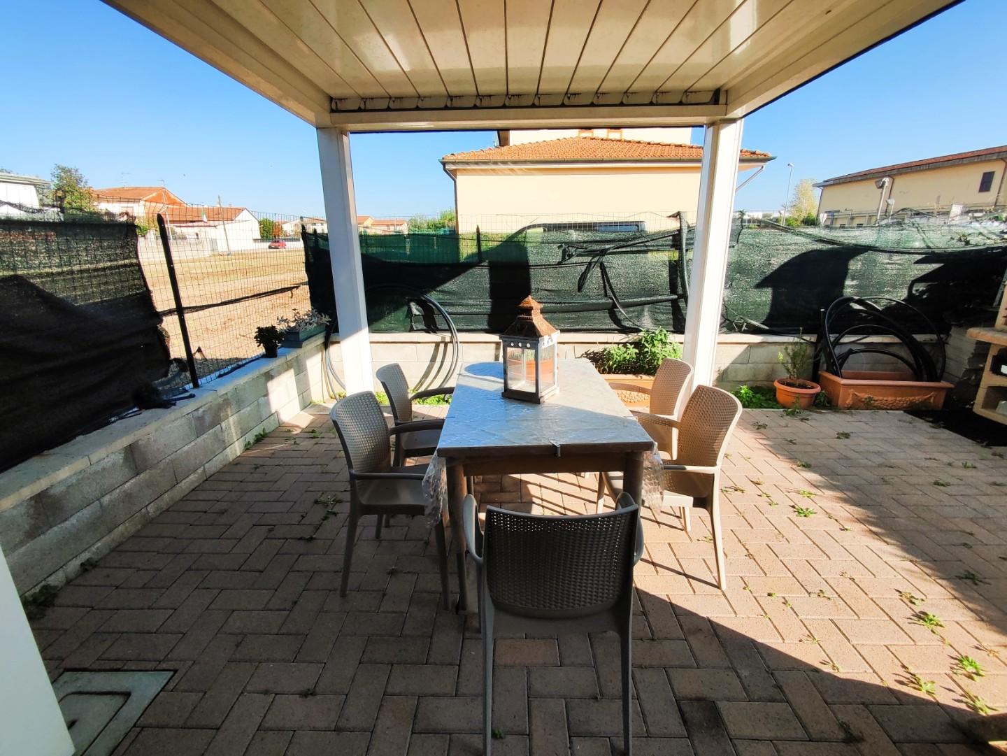La cucina abitabile è spaziosa e luminosa, con affaccio diretto sullo spazio esterno attrezzato con pergolato, barbecue e tavolino.