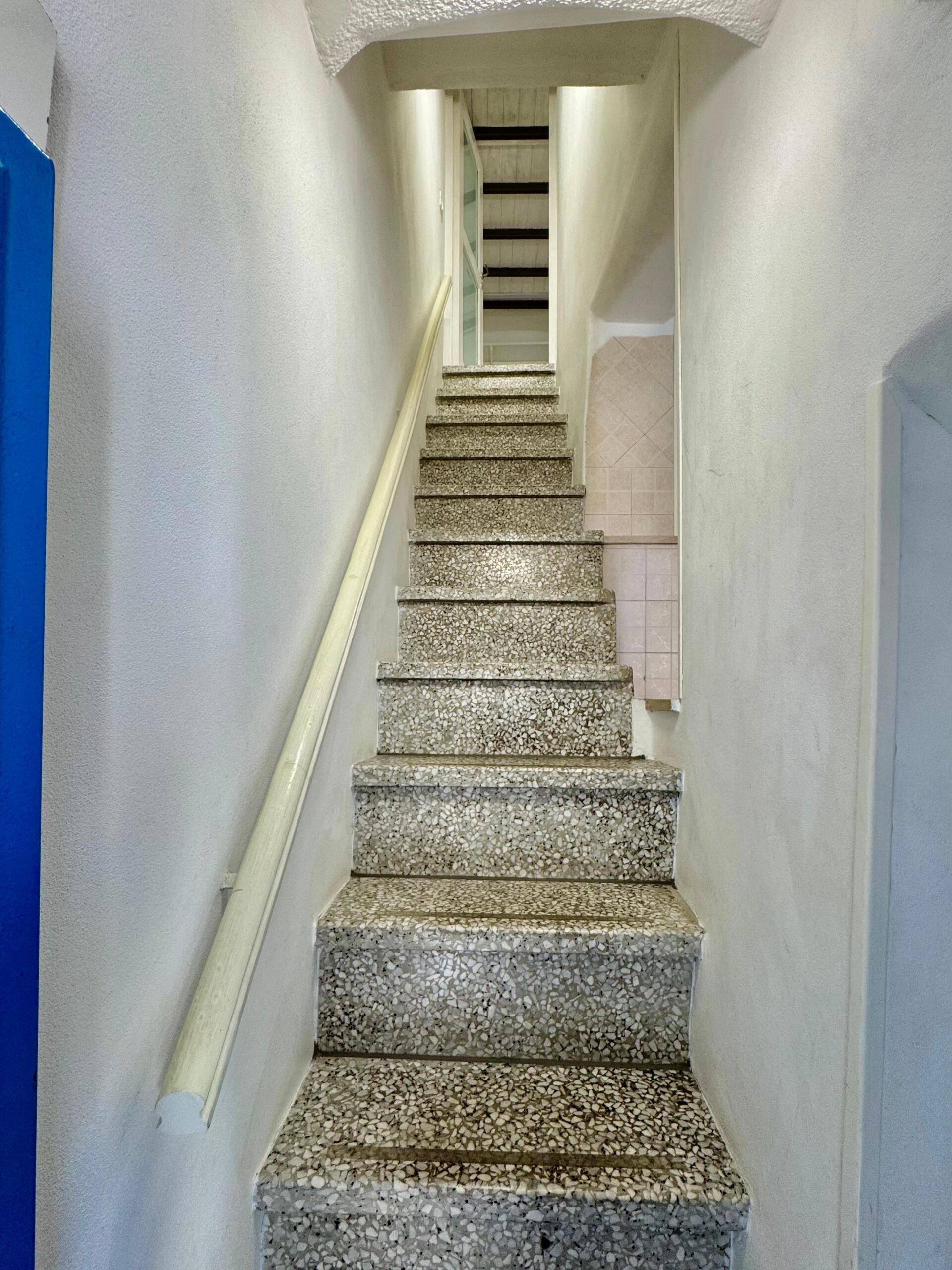 Sullo stesso livello, comodamente posizionato a servizio della zona giorno, è presente il bagno, rifinito in stile contemporaneo e pratico, con doccia ampia e soluzioni essenziali pensate per un utilizzo quotidiano e per lospitalità. Salendo al livello superiore si accede alla camera matrimoniale, caratterizzata da soffitti alti con archi e da una piacevole sensazione di ampiezza.