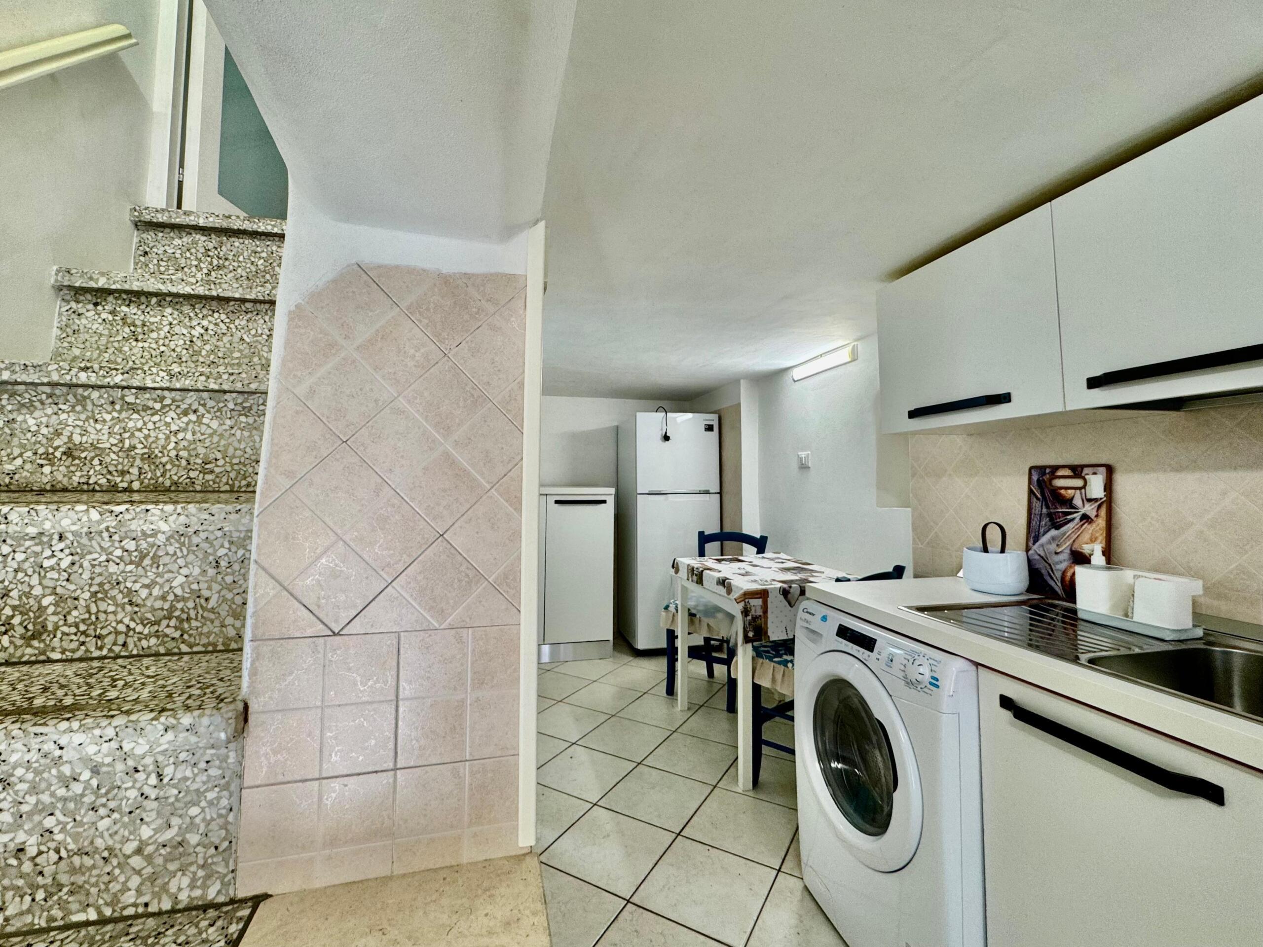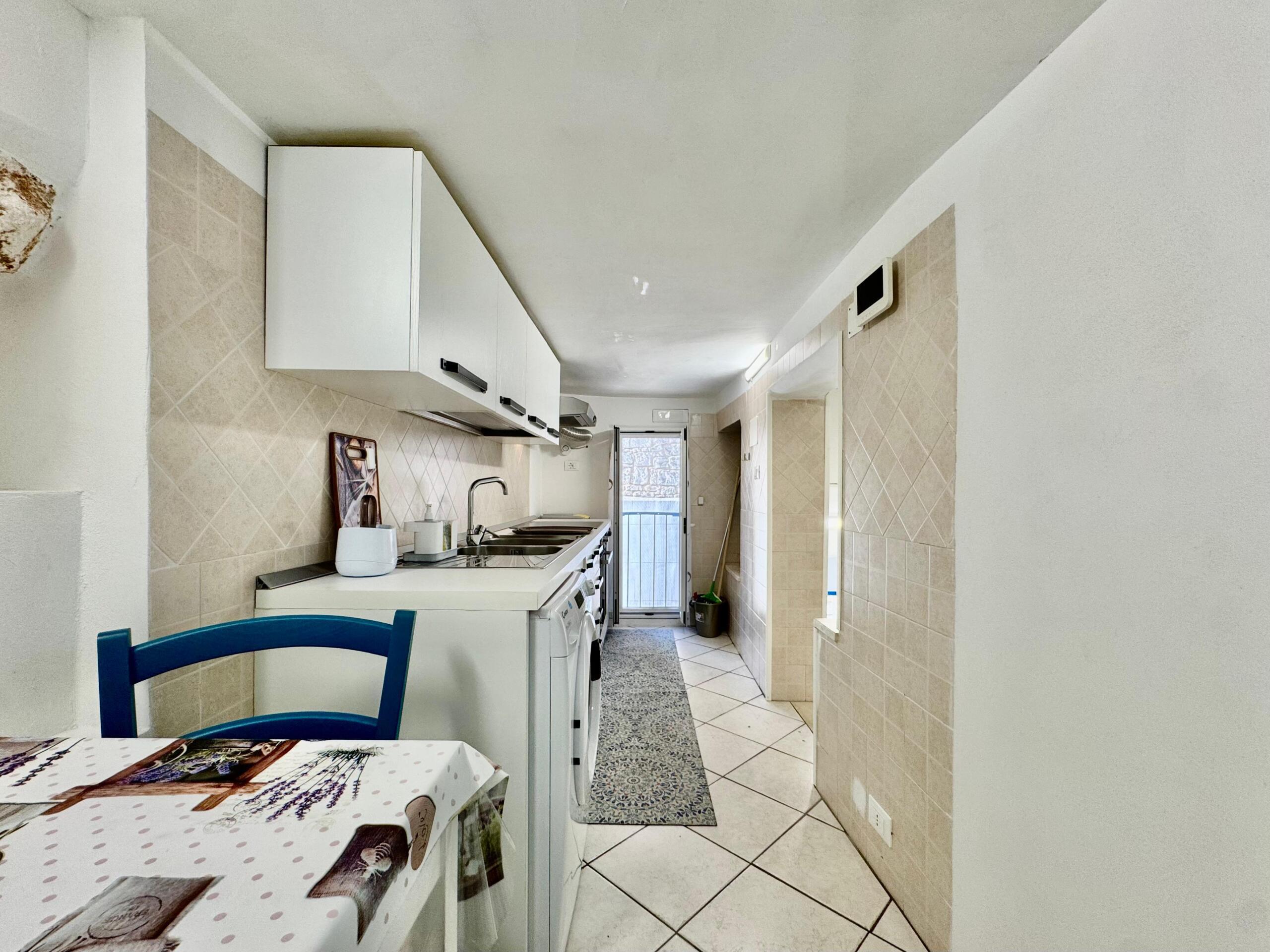 Laccesso avviene direttamente dalla strada, tramite una breve scala esterna tipica del contesto urbano ostunese, che conduce al caratteristico portoncino blu della proprietà. Lingresso introduce alla zona giorno con cucina, un ambiente funzionale e ben organizzato, dotato di cucina moderna con piano a induzione, elettrodomestici di nuova generazione e lavatrice, oltre a uno spazio dedicato al tavolo da pranzo.