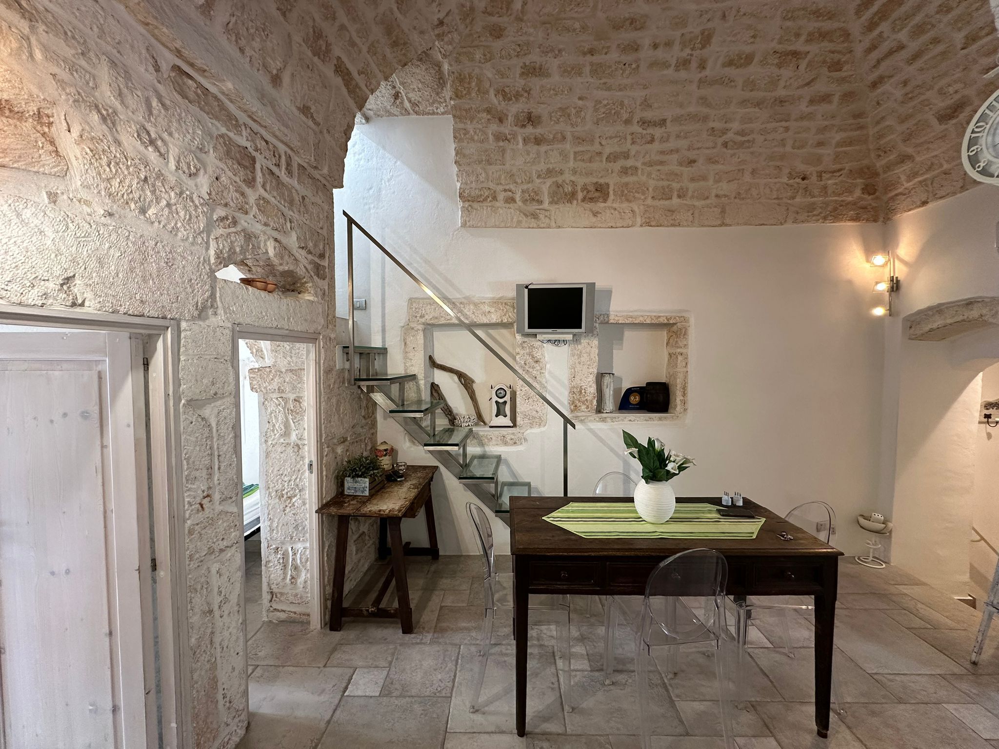 Laccesso avviene tramite una scala con le tipiche chianche storiche che conduce al primo piano, dove si sviluppa la zona abitativa con un bagno, due camere da letto di cui una più ampia, unalcova che ospita un comodo divano letto e una cucina ben organizzata.