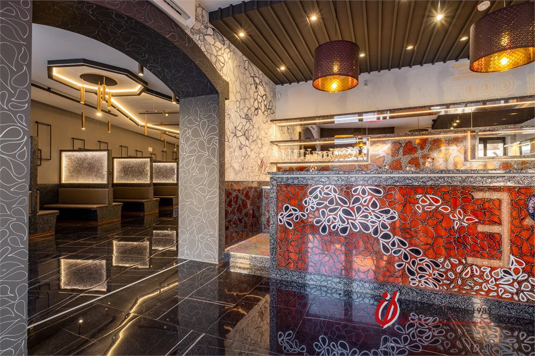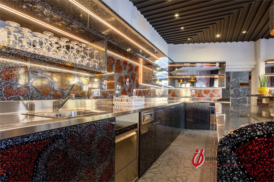 Al piano terra, una zona bar con cucina professionale e una sala da pranzo.