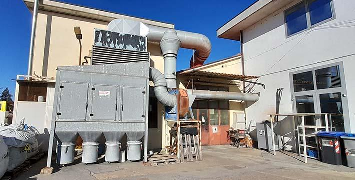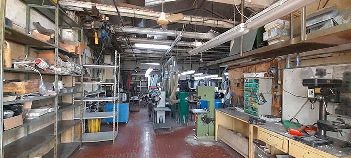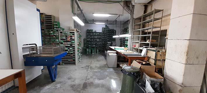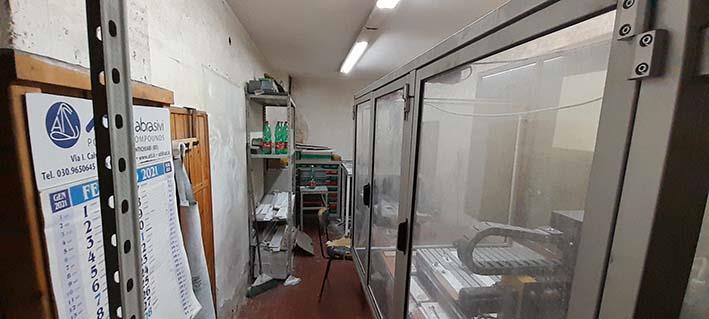 Piano terra: sono presenti un laboratorio, un magazzino, due ripostigli, un servizio igienico con antibagno, un vano montacarichi e un corpo scala di collegamento al piano superiore.