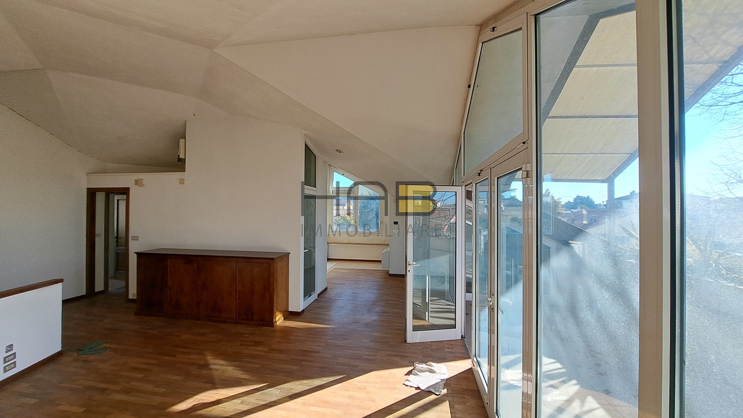 Si tratta di uno splendido appartamento mansardato, anch'esso completamente pavimentato a parquet, con grande open space estremamente luminoso grazie alle grandi vetrate che danno acesso ad un terrazzo a vasca di 18mq. Nella zona notte due camere matrimoniali, terza camera/studio e due servizi.