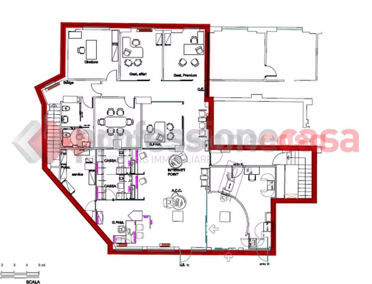 Laccesso avviene direttamente da ingresso pedonale posto lungo Piazza Paleario; il piano terra caratterizzato da un locale open space e da alcuni uffici singoli realizzate mediante lutilizzo di pareti mobili vetrate o in cartongesso mentre il piano interrato, collegato con vano scale pertinenziale, ospita alcuni archivi, locali tecnici e il caveau.