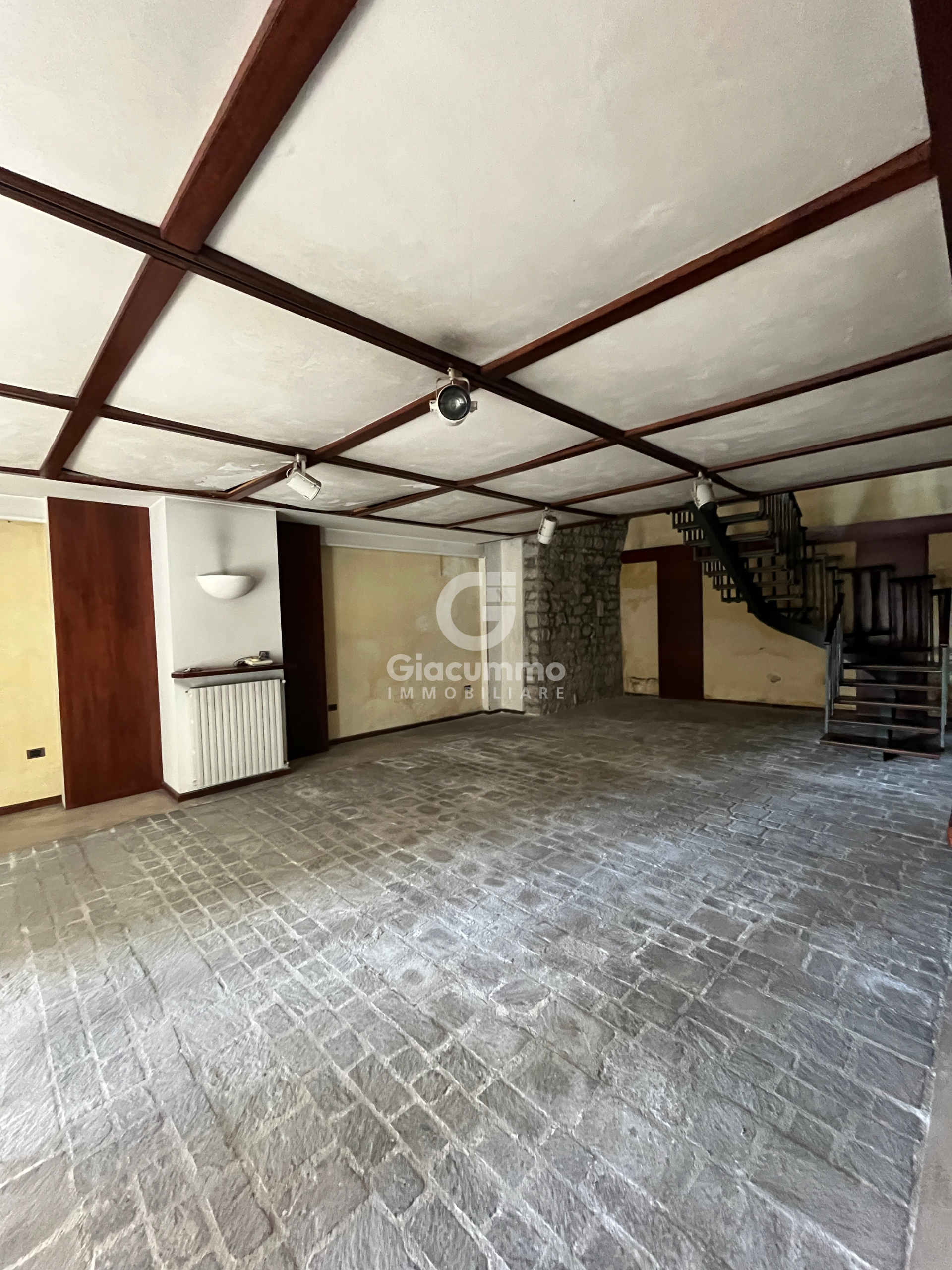 Il piano inferiore si distingue per una pavimentazione accattivante con dettagli in pietra, che conferiscono personalità e riconoscibilità allo spazio, mentre il piano superiore è rifinito con un piacevole parquet, ideale per ambienti più rappresentativi o direzionali.