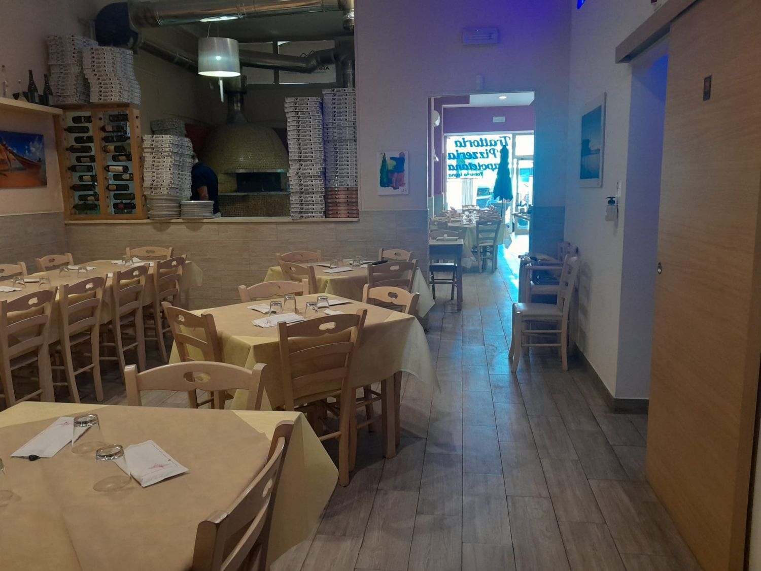 La cucina è dotata di friggitrice, bollitore, n. 2 piastre, n. 4 fuochi, lavastoviglie; la sala è composta da 60 posti interni, 3 climatizzatori, forno a legna, canalina per arrosticini.