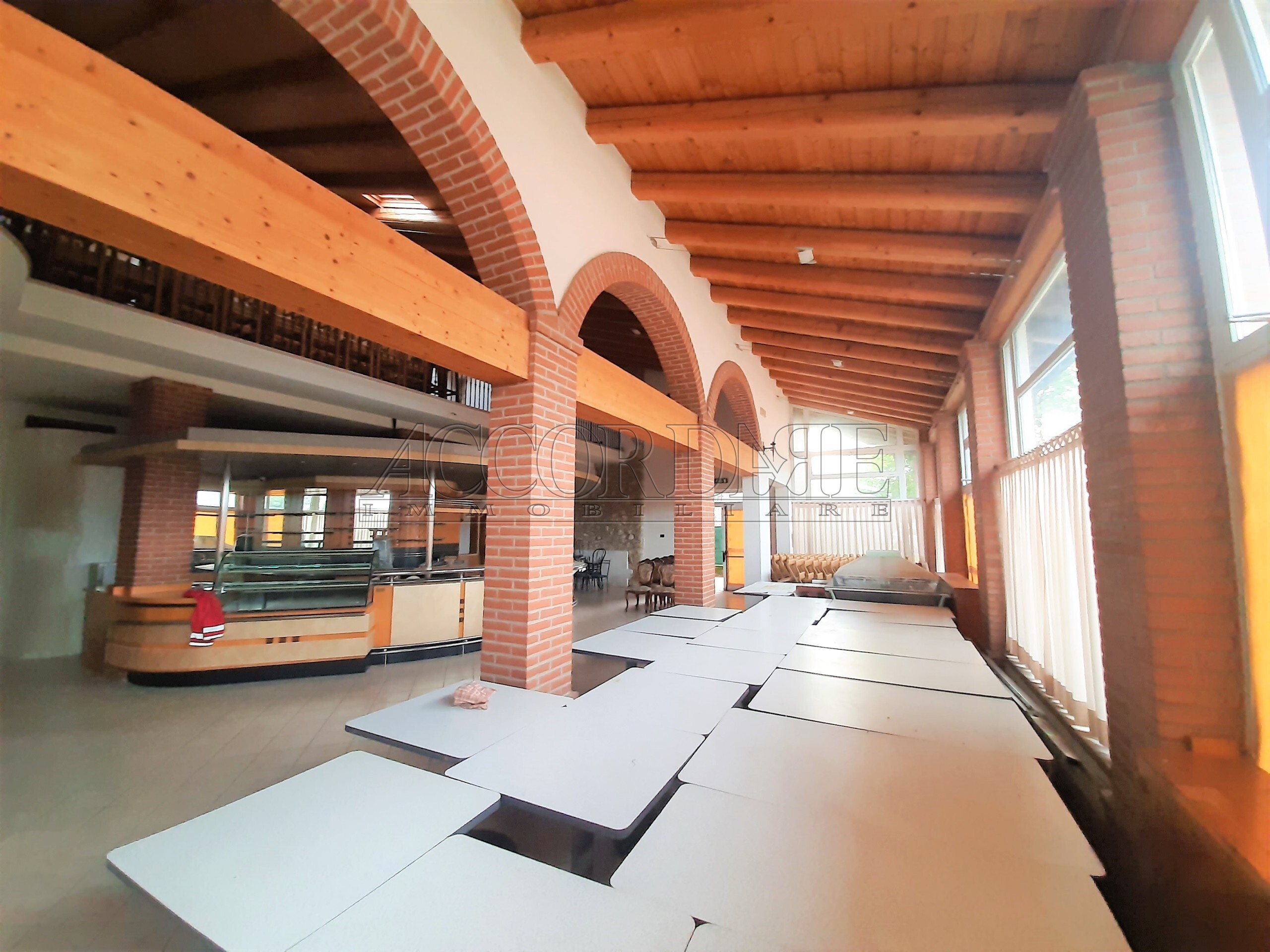 VILLAGA, immobile commerciale adibito a pub-birreria con grande area bar, servizi cucina, deposito e portici al piano terra; soppalco con area ricreativa al piano primo.