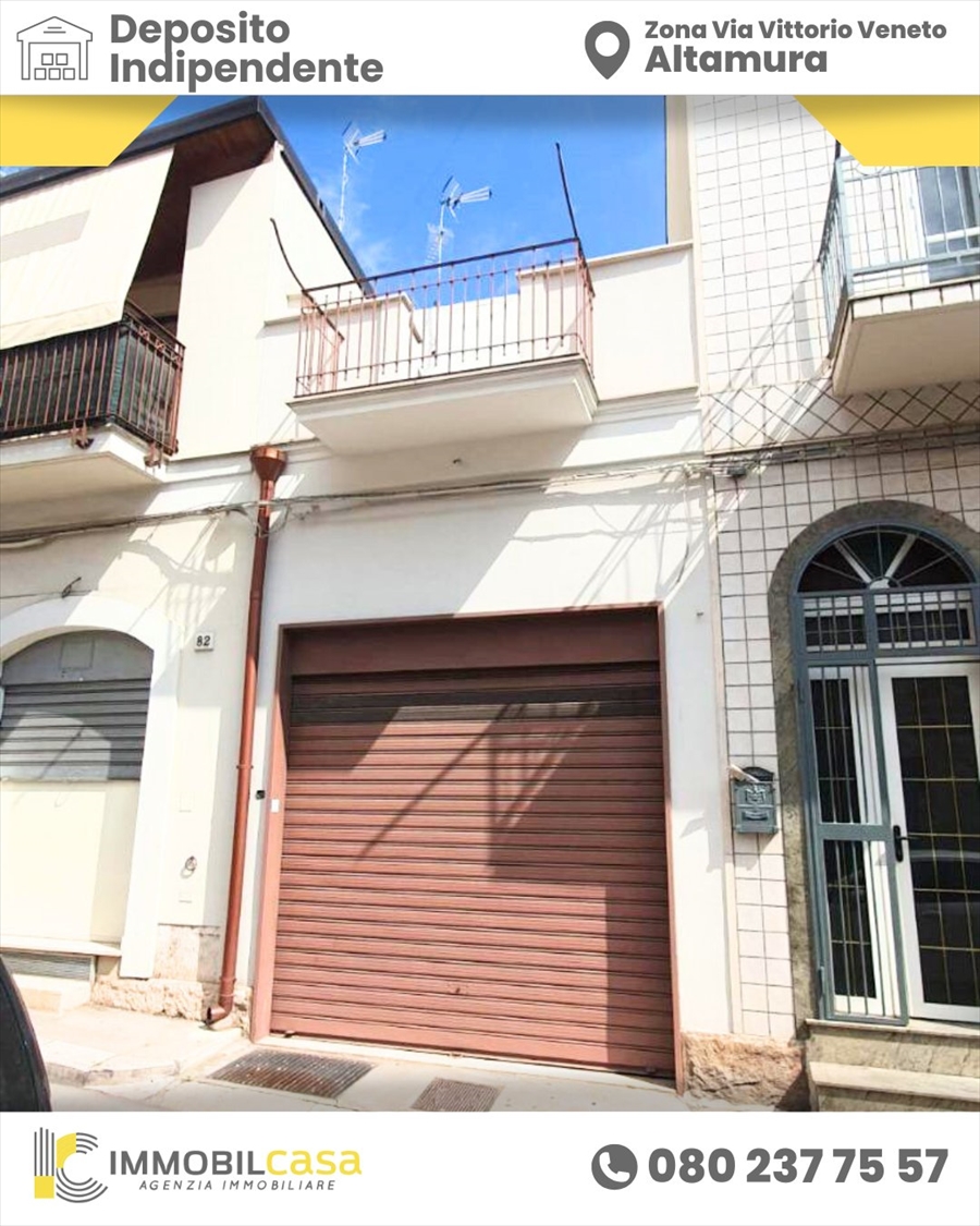 rif 20 Ad Altamura, nella centrale zona di via Vittorio Veneto, proponiamo la vendita di un deposito di 46 mq al piano terra, indipendente, con accesso a cantina a piano interrato di 45 mq. Il deposito è libero, e su di esso è stato approvato un progetto per la realizzazione di un duplex indipendente. Contatta l'inserzionista