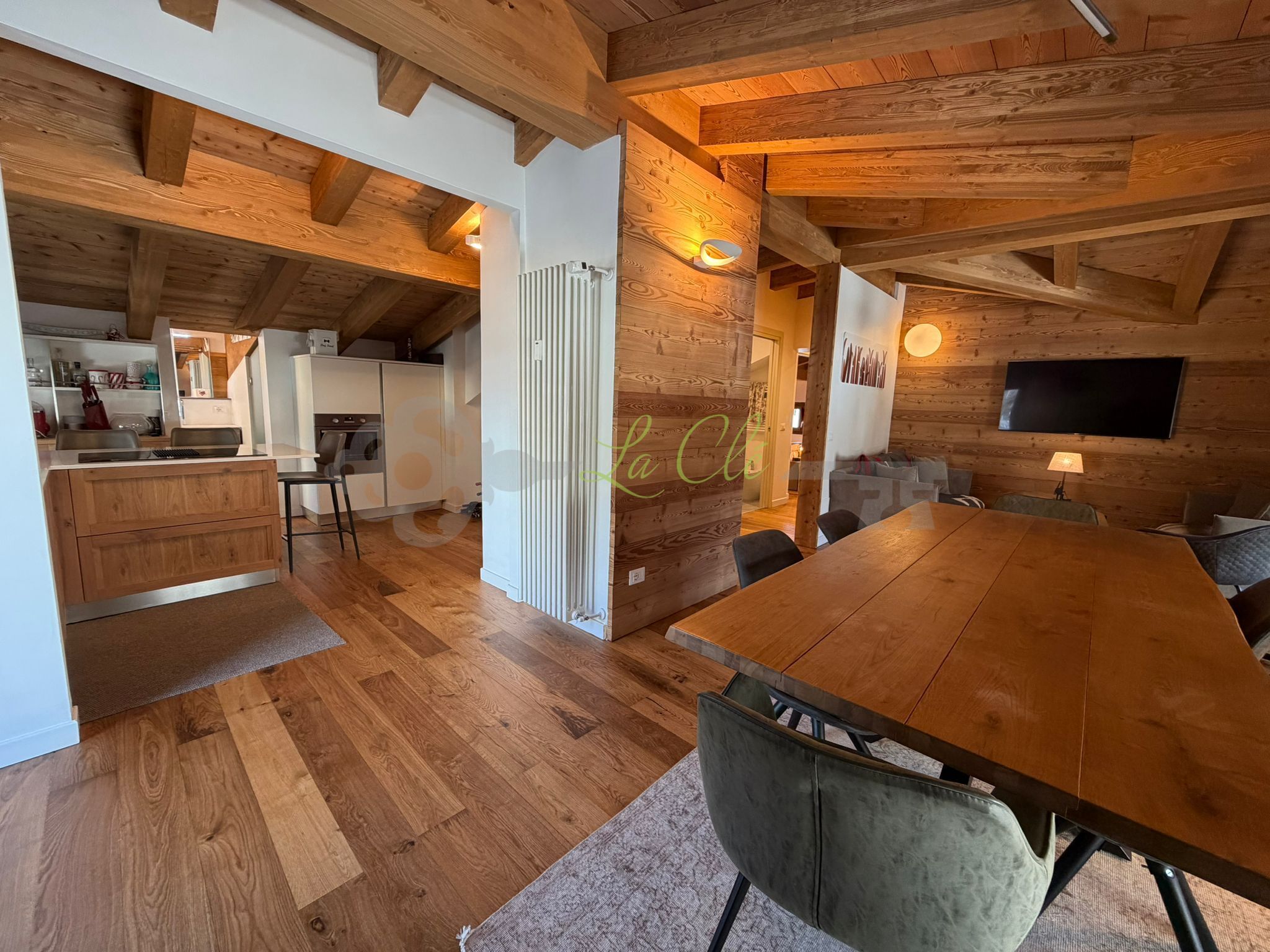 Lingresso si apre su un comodo disimpegno che conduce a un ampio e luminosissimo soggiorno, arricchito da balconi, camino e da una magnifica vista panoramica sulla Catena del Bianco, con zona pranzo e area living.
