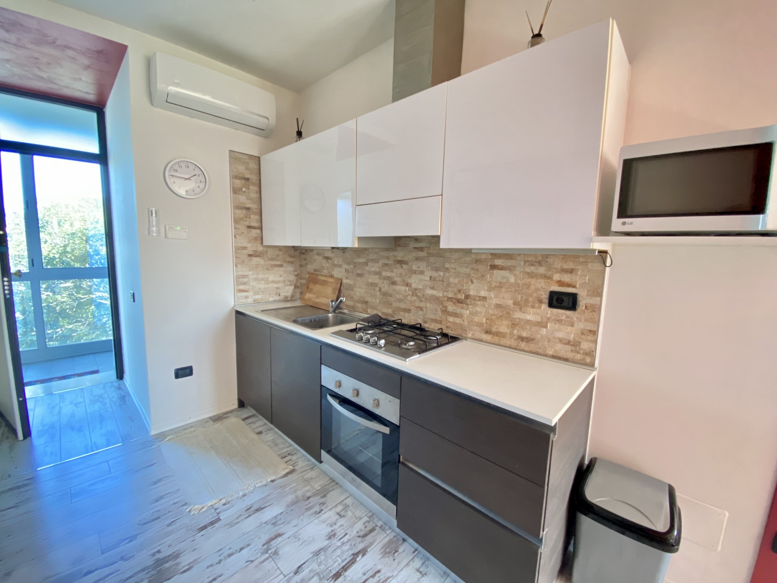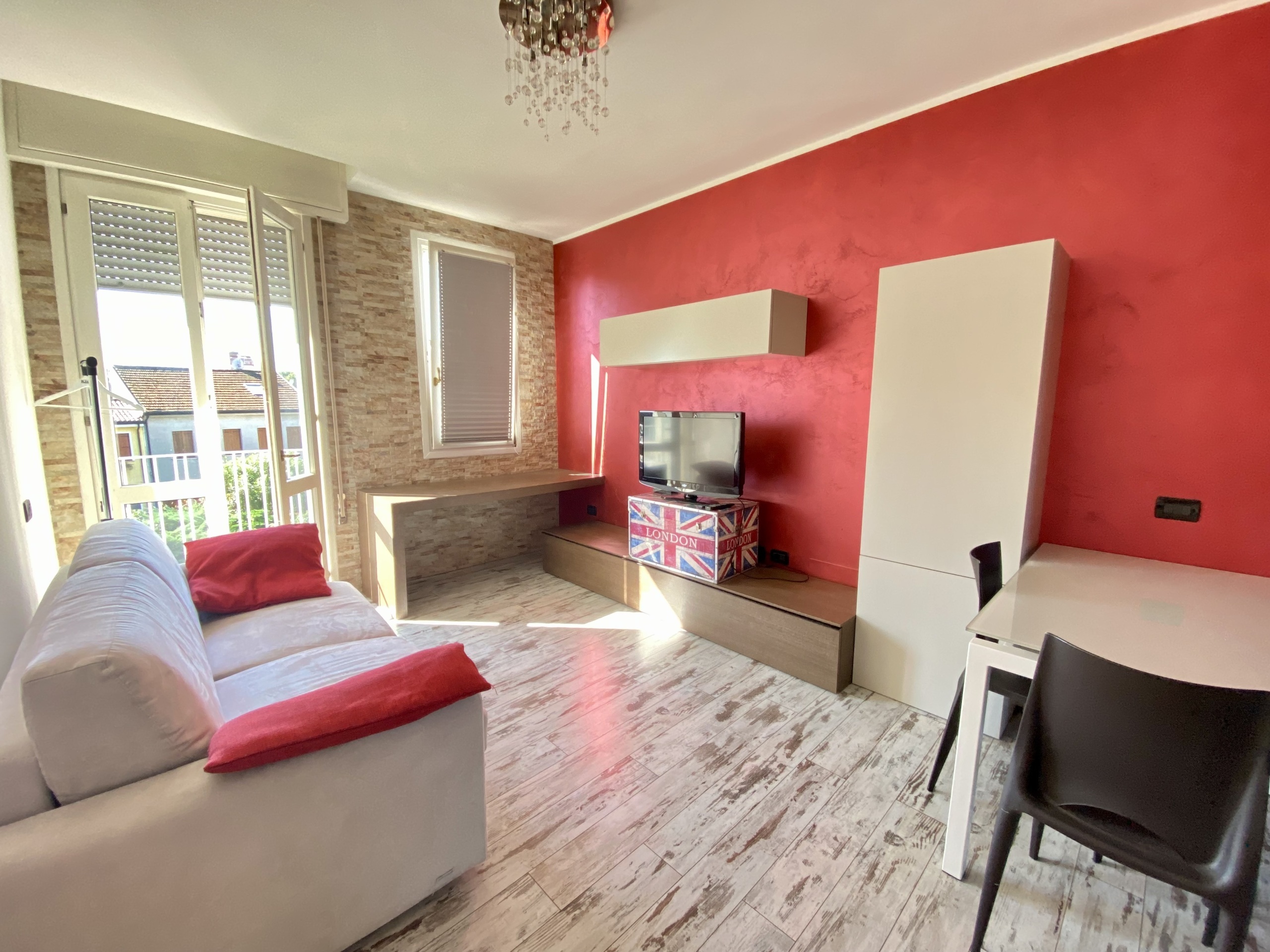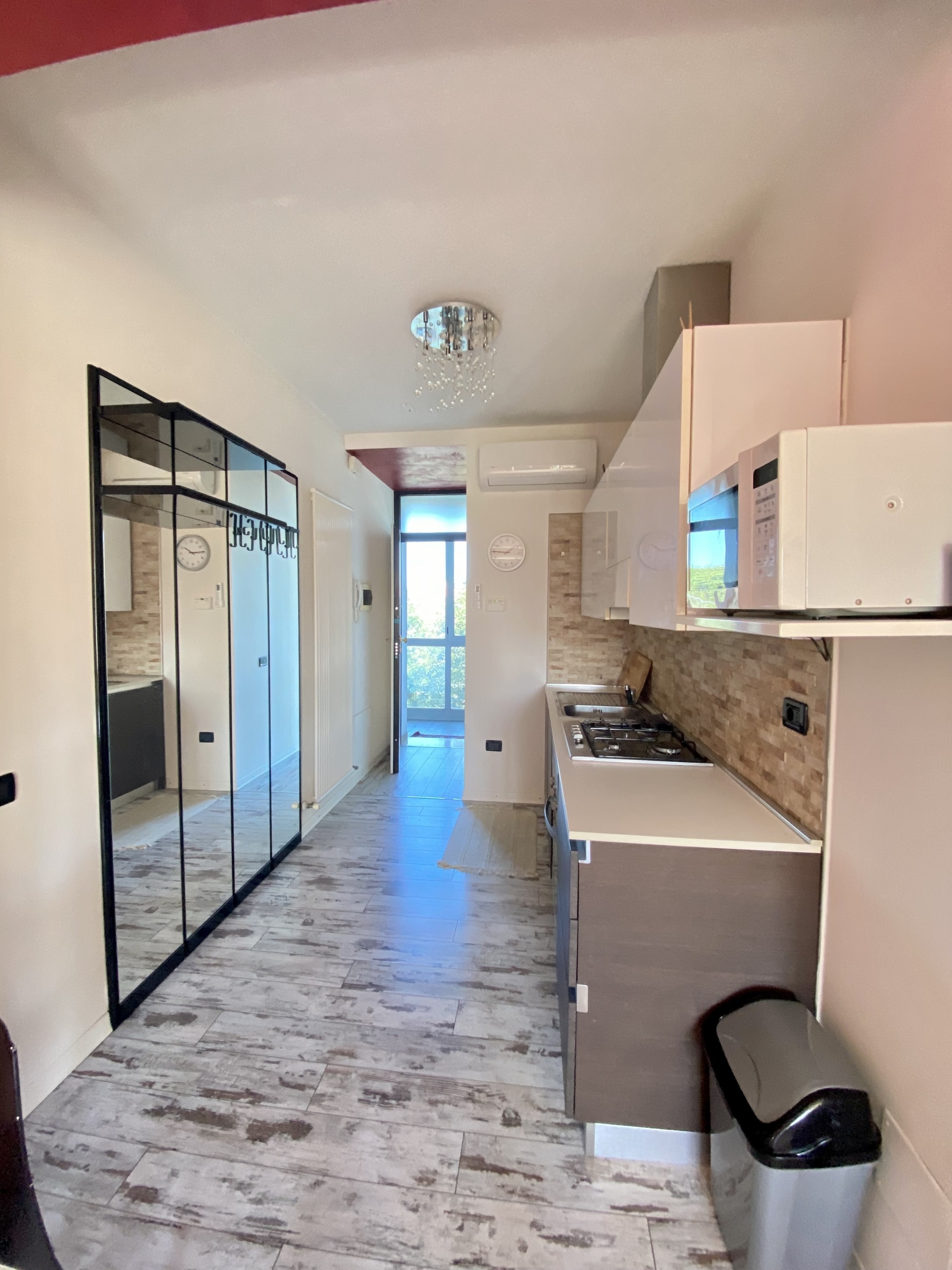 Internamente è composto da ingresso con angolo cottura a vista, soggiorno con divano a letto e parete attrezzata con tv, disimpegno dove troviamo la lavatrice e un armadio, infine il bagno con doccia.