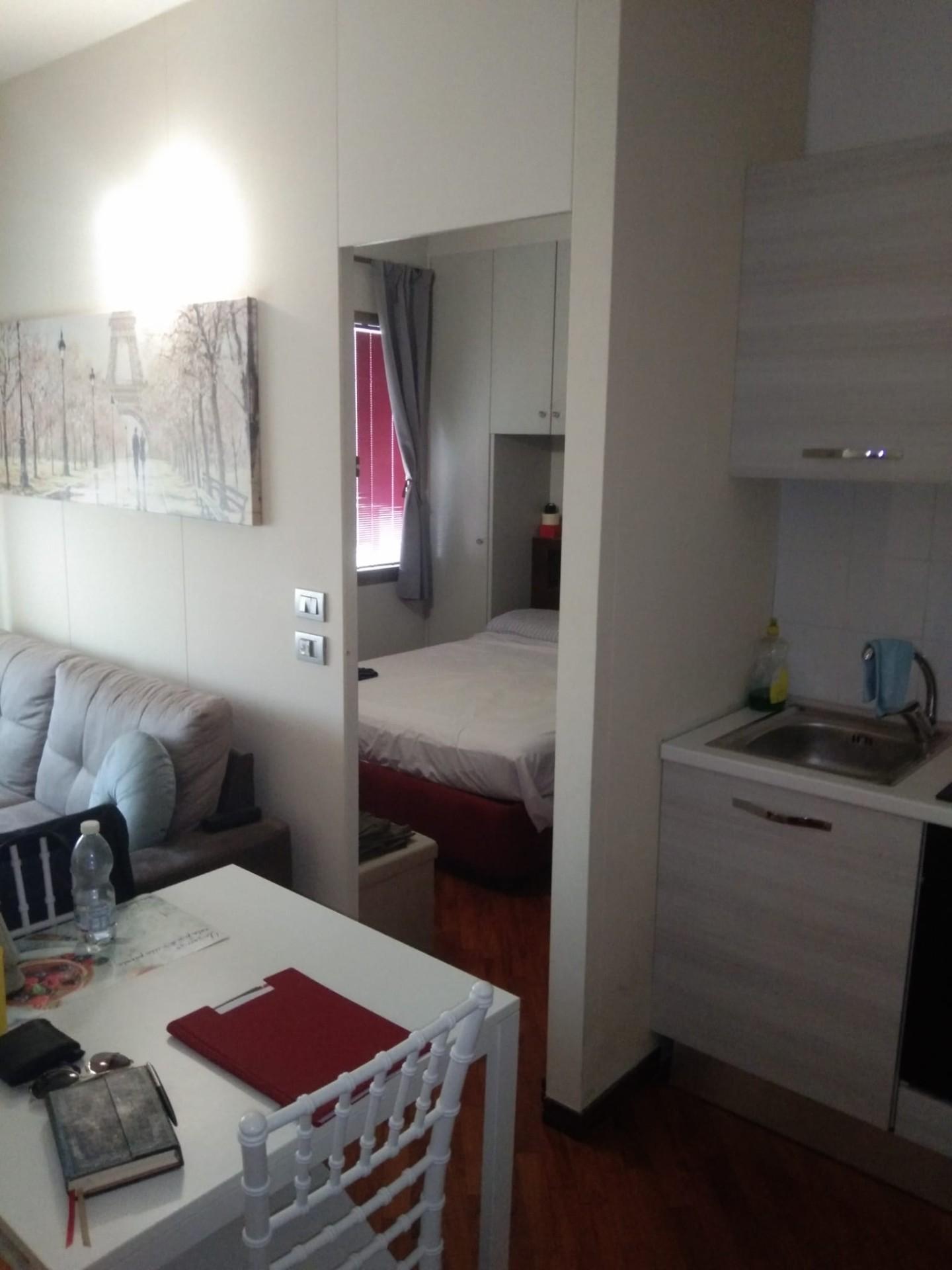 Pur nascendo come vano unico, la zona giorno/angolo cottura è ben separata dalla zona notte a mezzo parete in legno e porta.