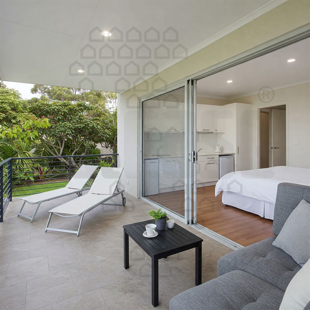 l'appartamento e situato a piano terra ed e' composto da living con angolo cottura e zona notte, 1 bagno e ampia veranda esterna con giardino.