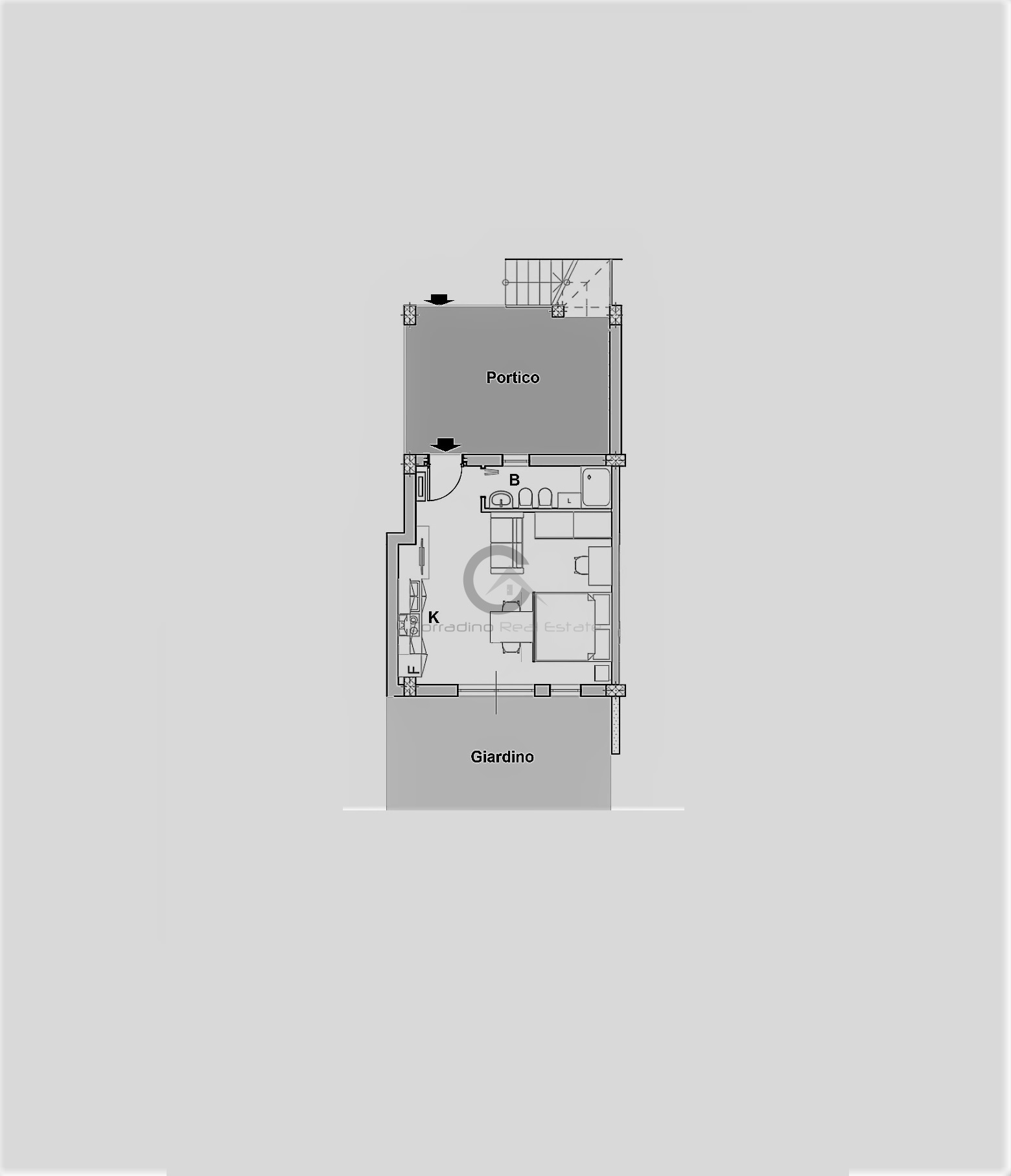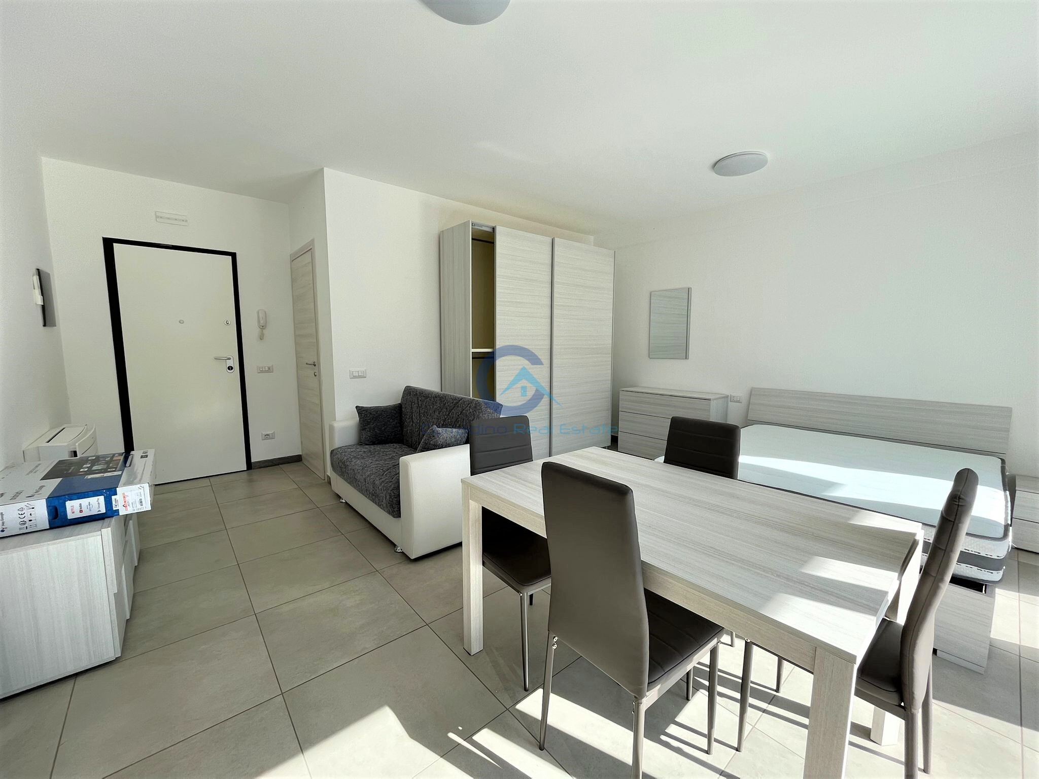 L'appartamento si compone da ununica zona living/notte con cucina a vista dotata di piano cottura ad induzione, letto matrimoniale, zona studio, bagno finestrato e ampio portico.